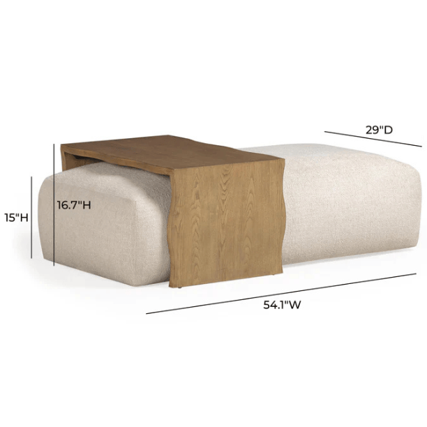 A plush wavy-edged silhouette meets clever functionality in the versatile Eugene Ottoman. Upholstered in cream or olive green performance basketweave fabric, it glides on hidden caster wheels and pairs with a bridge table that slides smoothly from side to side, delivering texture, movement, and style in one chic piece.
