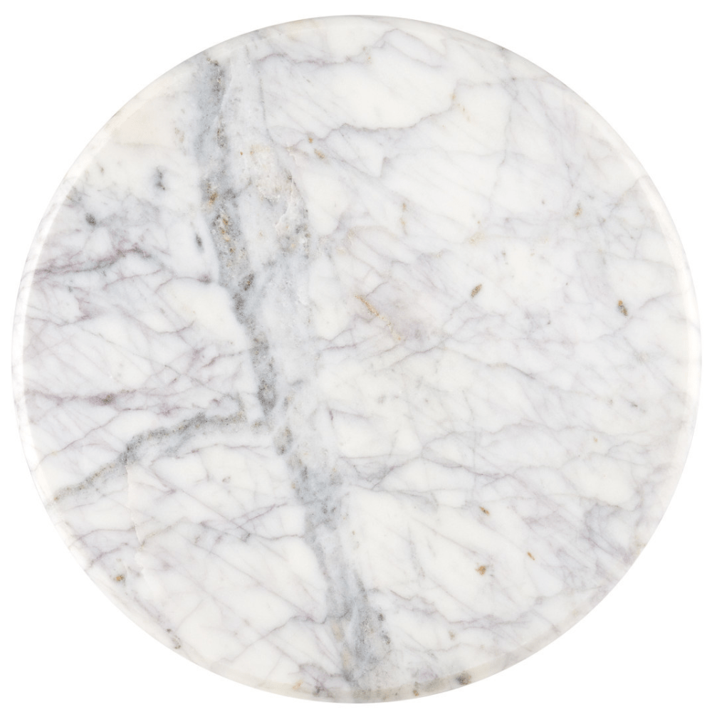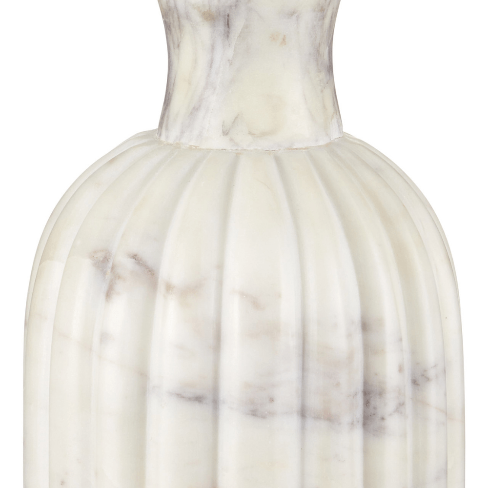 The Passementerie Drinks Table is a sculptural statement piece crafted from exquisite Banswara marble, known for its striking white surface with subtle purple veining. The tall, slender pedestal is carved to mimic two interconnected tassels—one rising toward the tabletop and the other descending toward the floor, the two cinched in the middle to create a captivating silhouette.