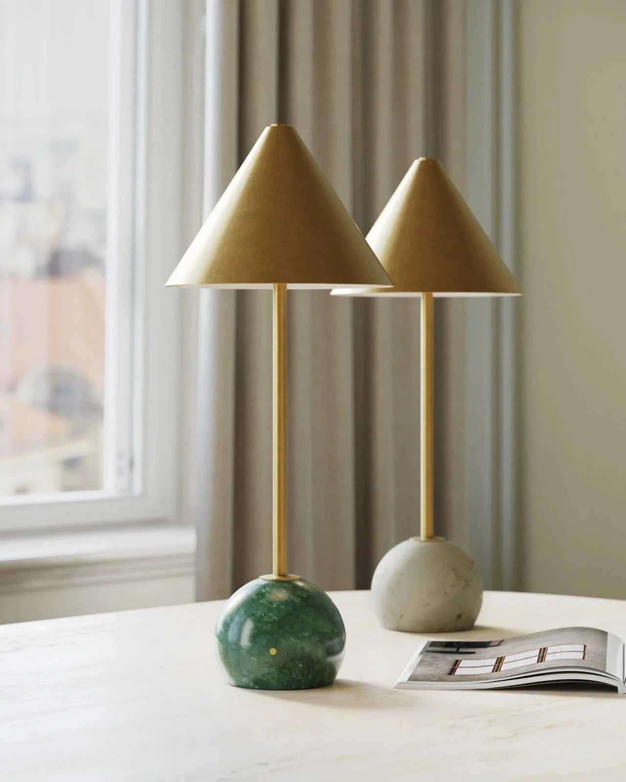 The Journey Cordless Table Lamp packs a fashionable punch for a portable design. The antique brass finish on the long thin stem and the cone-shaped shade brings it a subdued sophisticated gleam, while the marble globeon the bottom anchors the piece. At less than 20 inches tall, the gold lamp has an on and off button and a battery-life indication light that alerts when it is time to recharge on the side of the base.