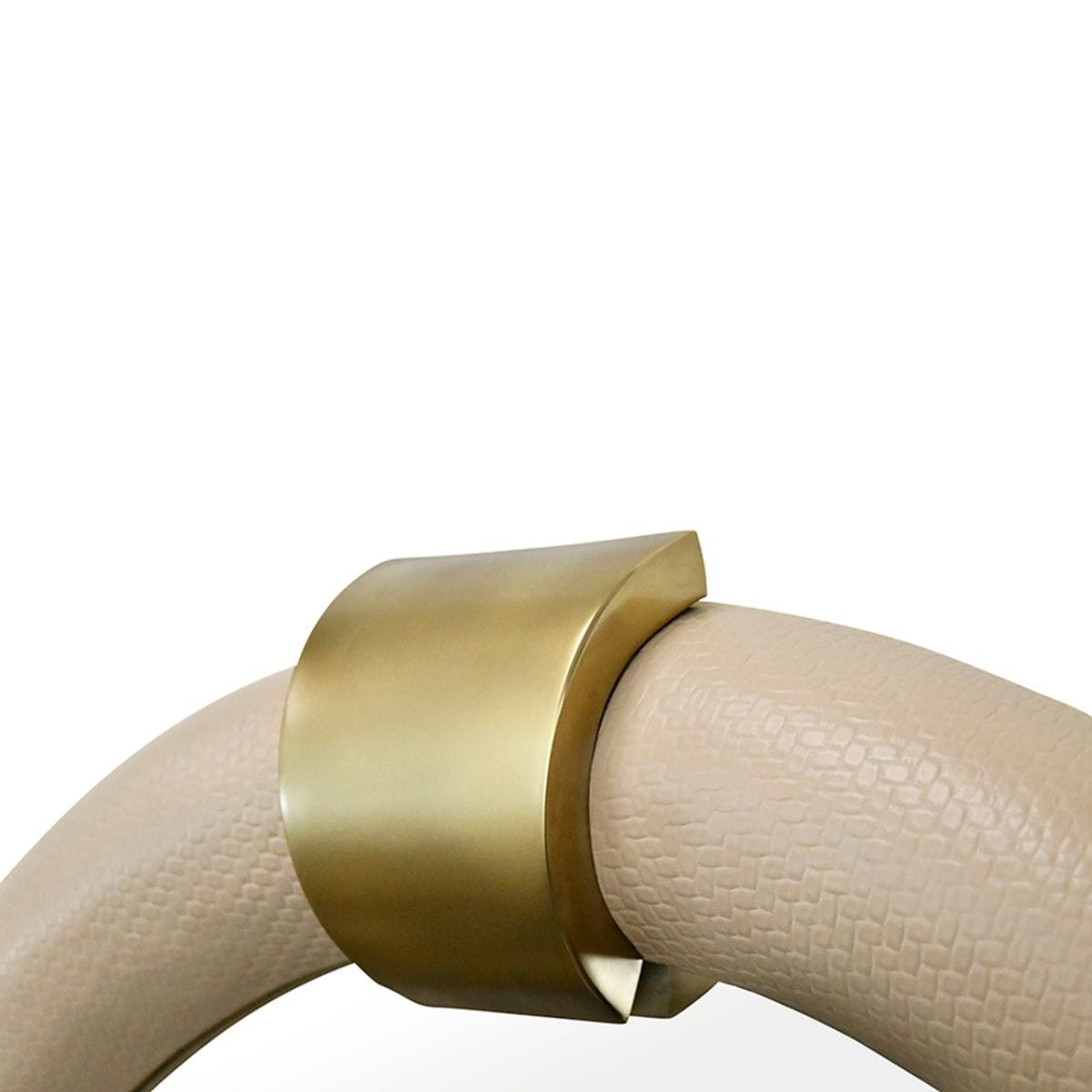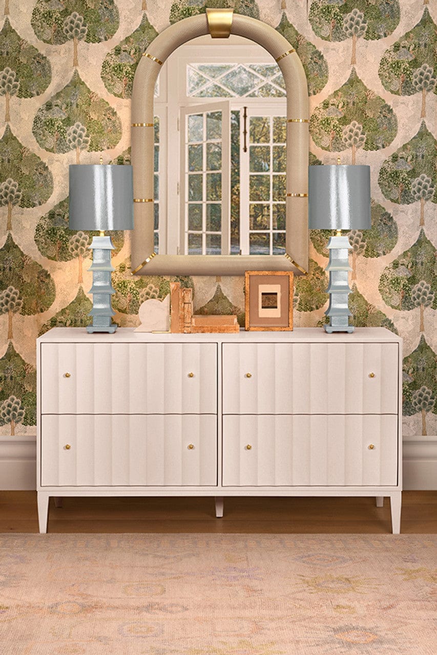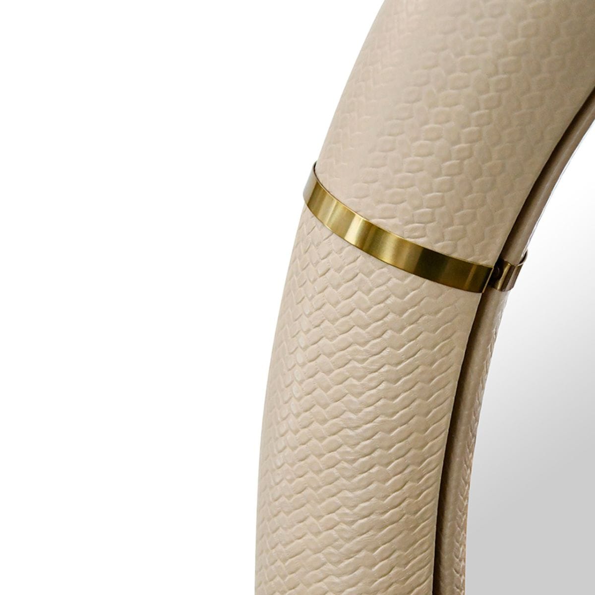 Arched faux ivory leather mirror with antique brass details.