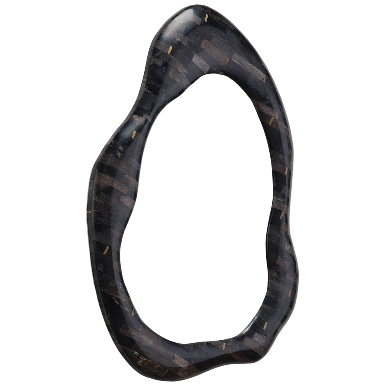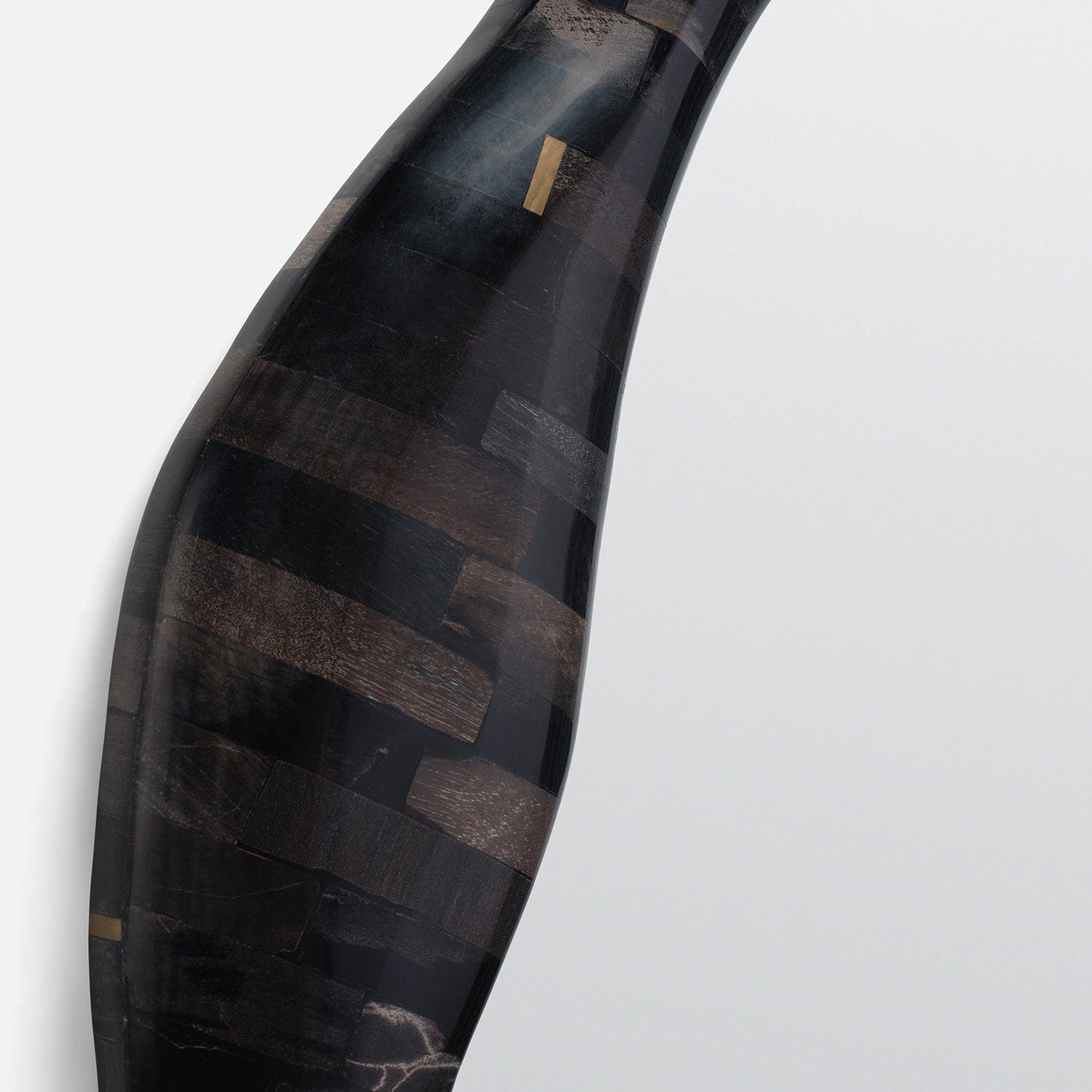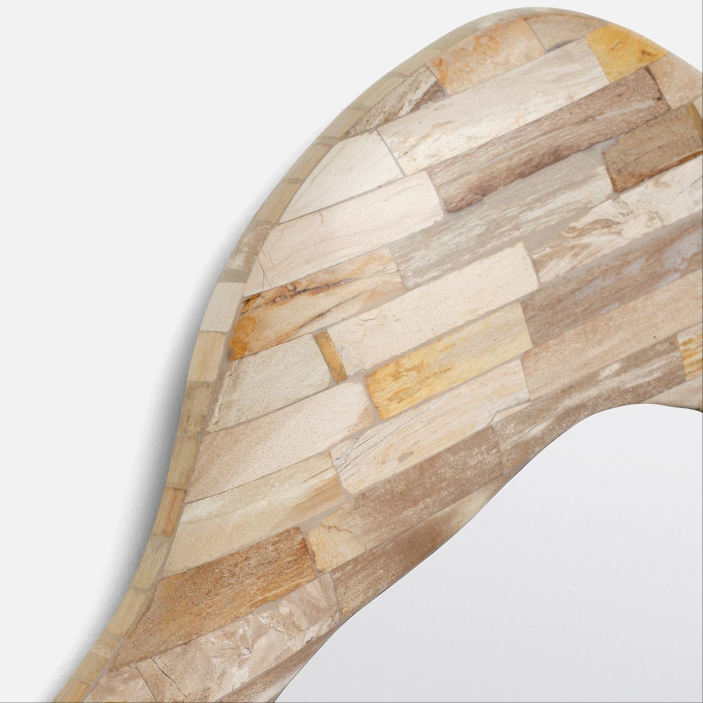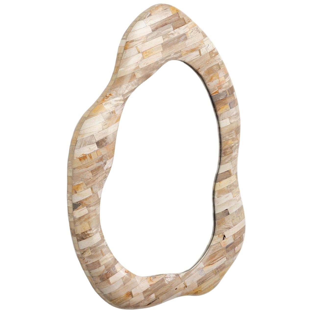 Abstract and asymmetrical, the Joss mirror is like no other with its tiled petrified wood and metal frame, organic shape, and beautifully subtle pattern.