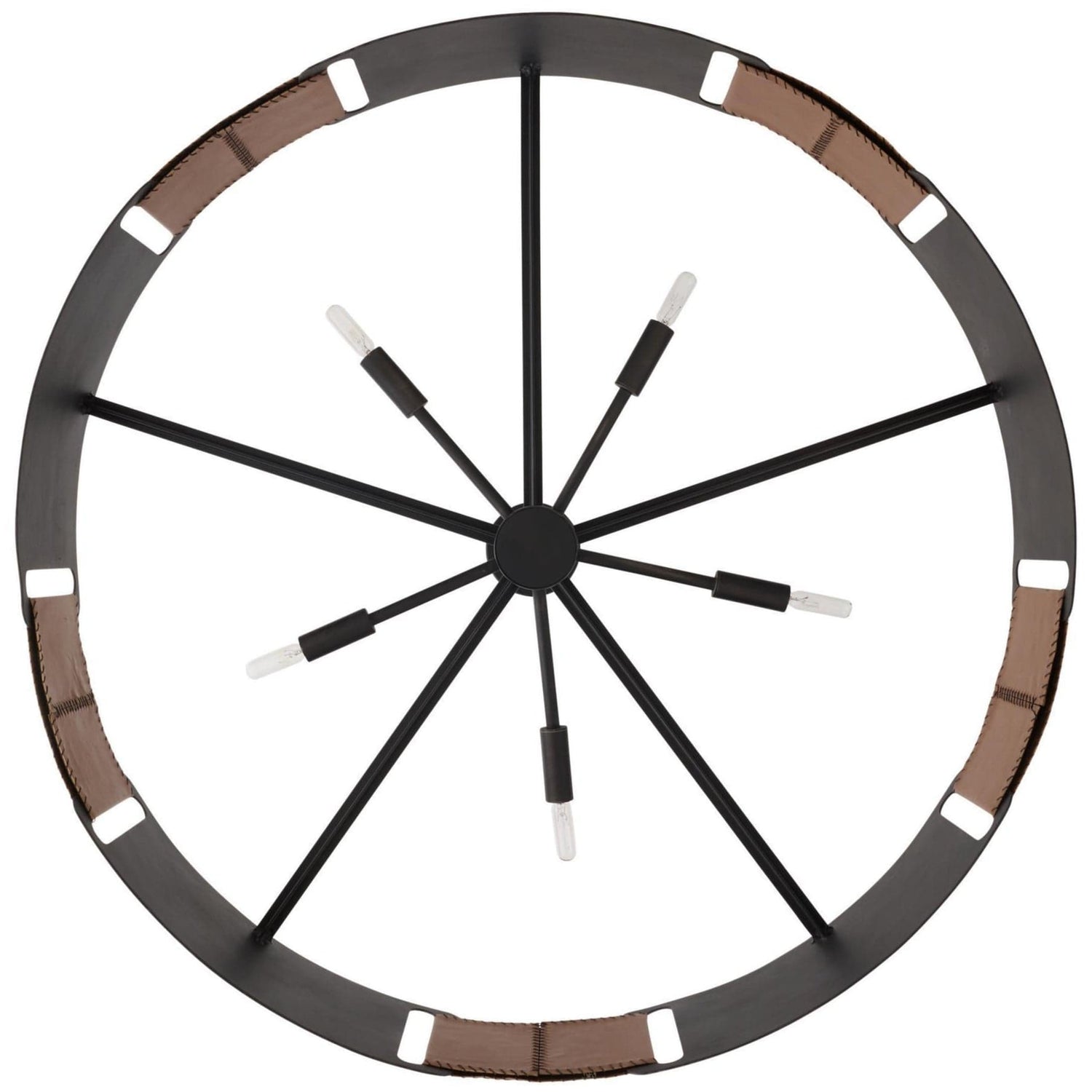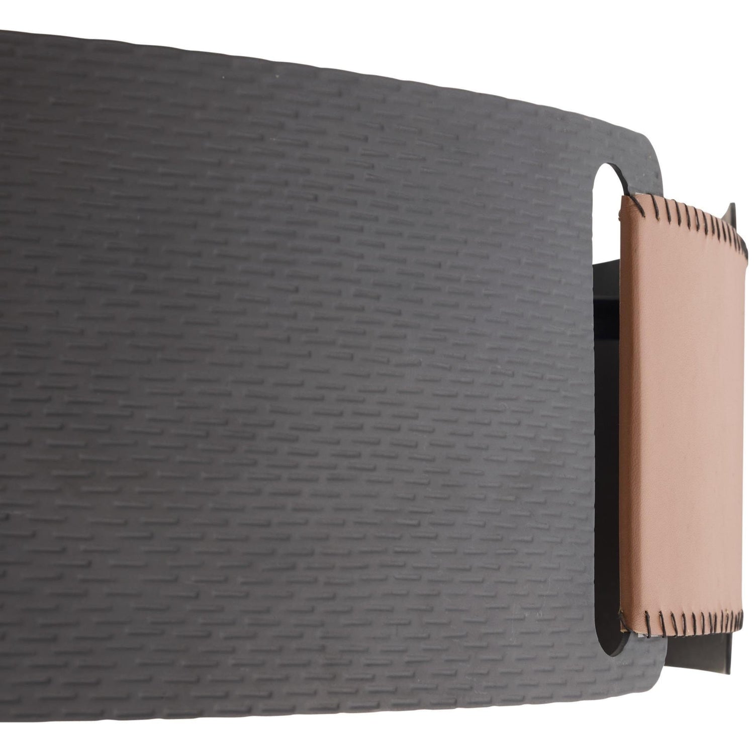 Whipstitched brown leather straps draw together a blackened hammered iron ring in a mix of texture and material. Reinventing equestrian language for the modern living space, this design plays with negative space via cutouts that allow the light to shine through. Blackened iron pipe and frame. Damp-rated, although limited covered outdoor conditions may affect finish. Finish will vary.