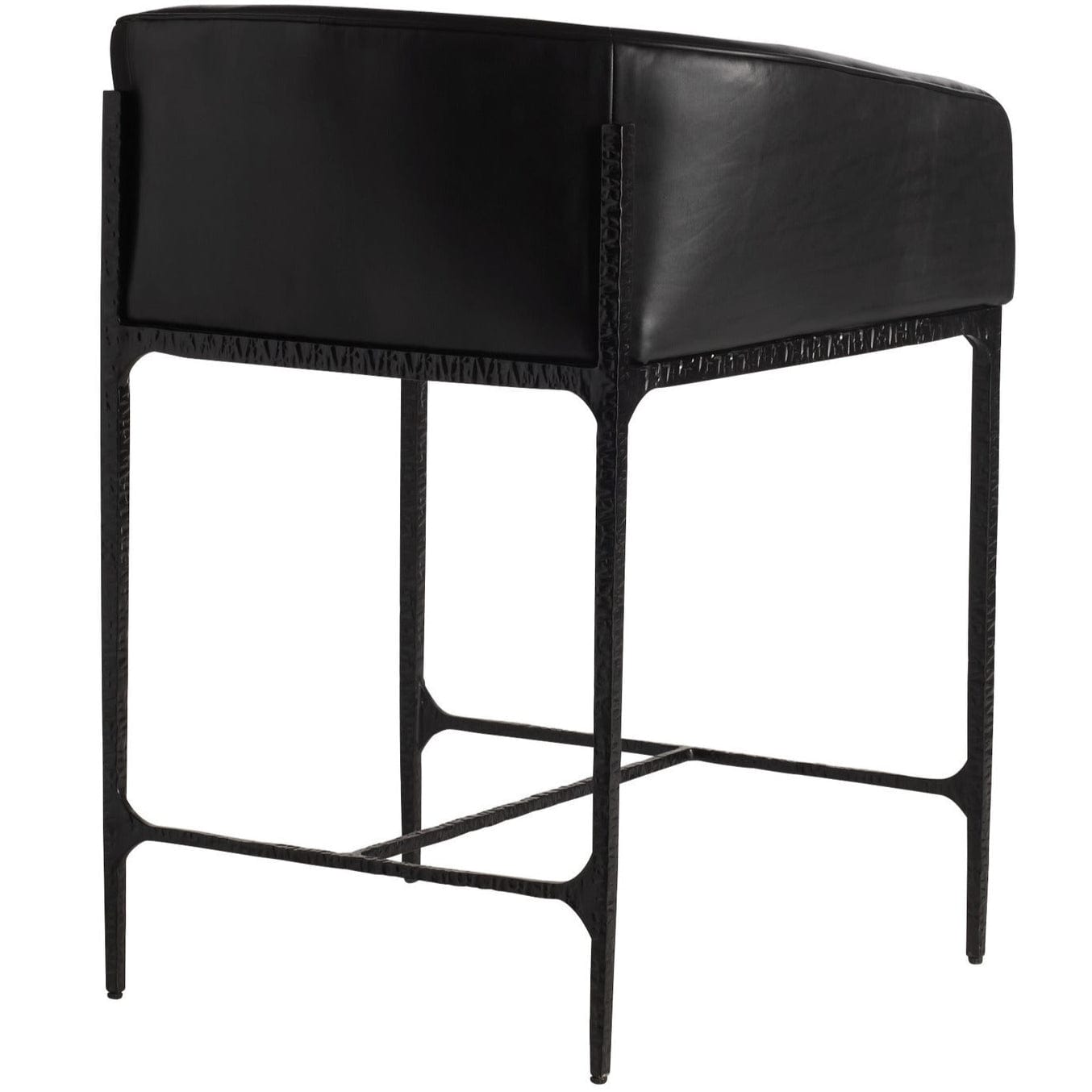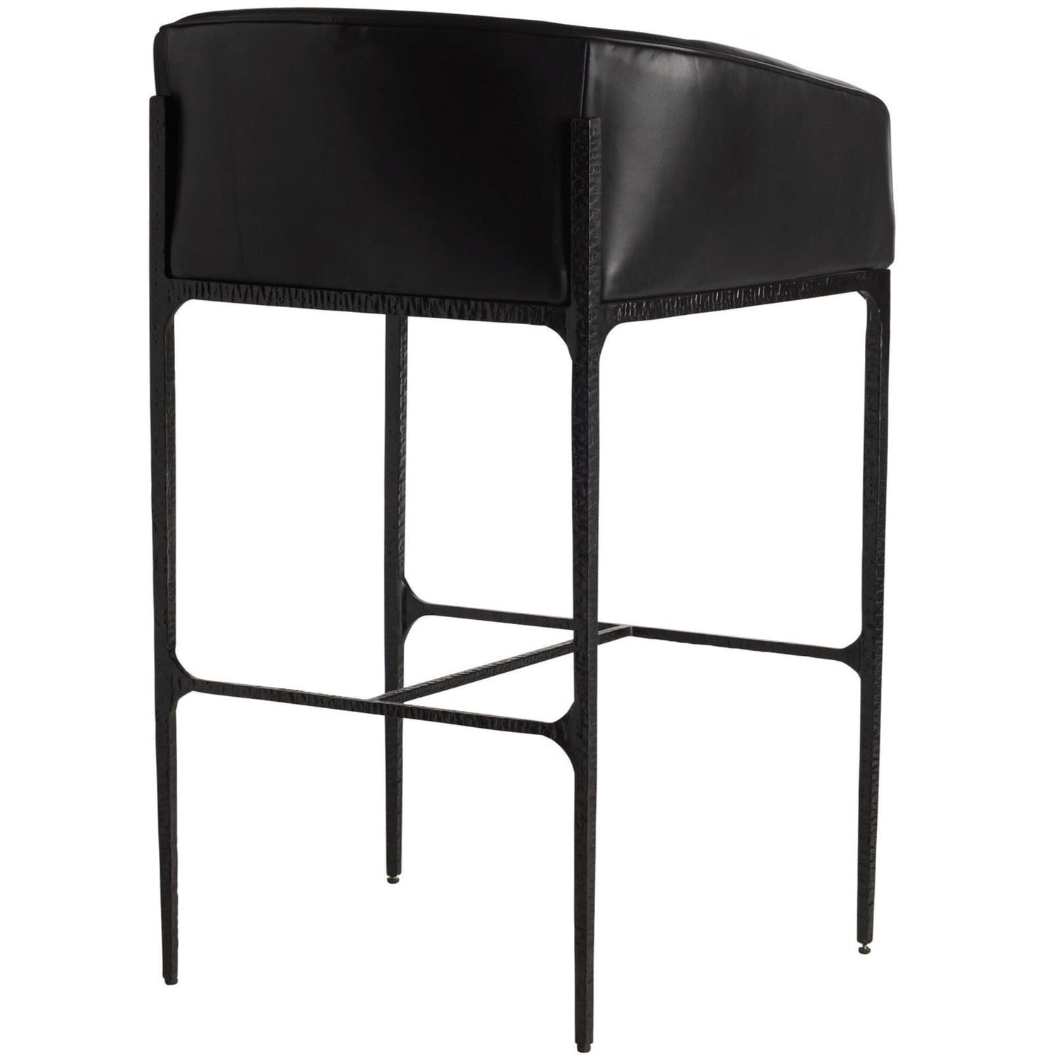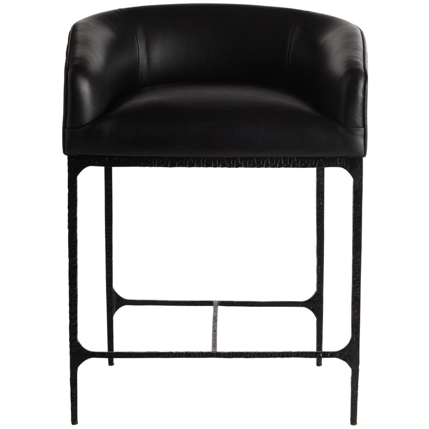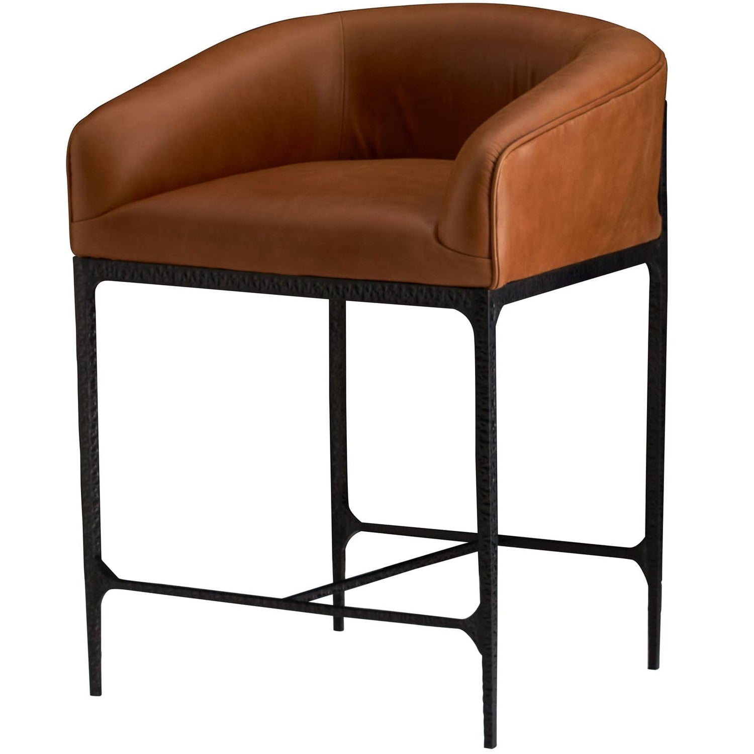 A hammered iron frame and handsome leather make this bar & counter stool ultra-chic. The low, barrel-style shape gives lumbar comfort and support while allowing the stool to tuck neatly under a bar or countertop. Its modern style brings sophistication and polish to a space. Leather and finish will vary.