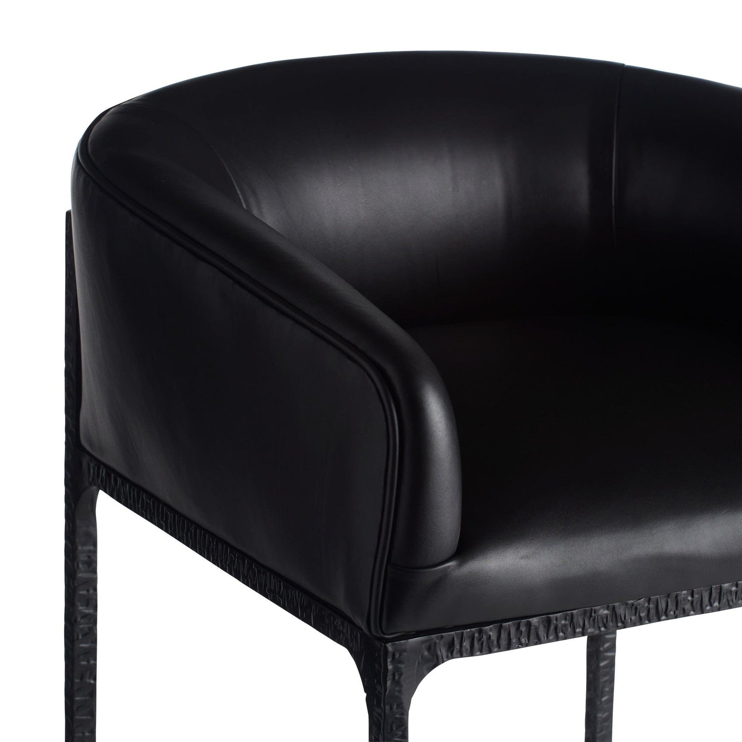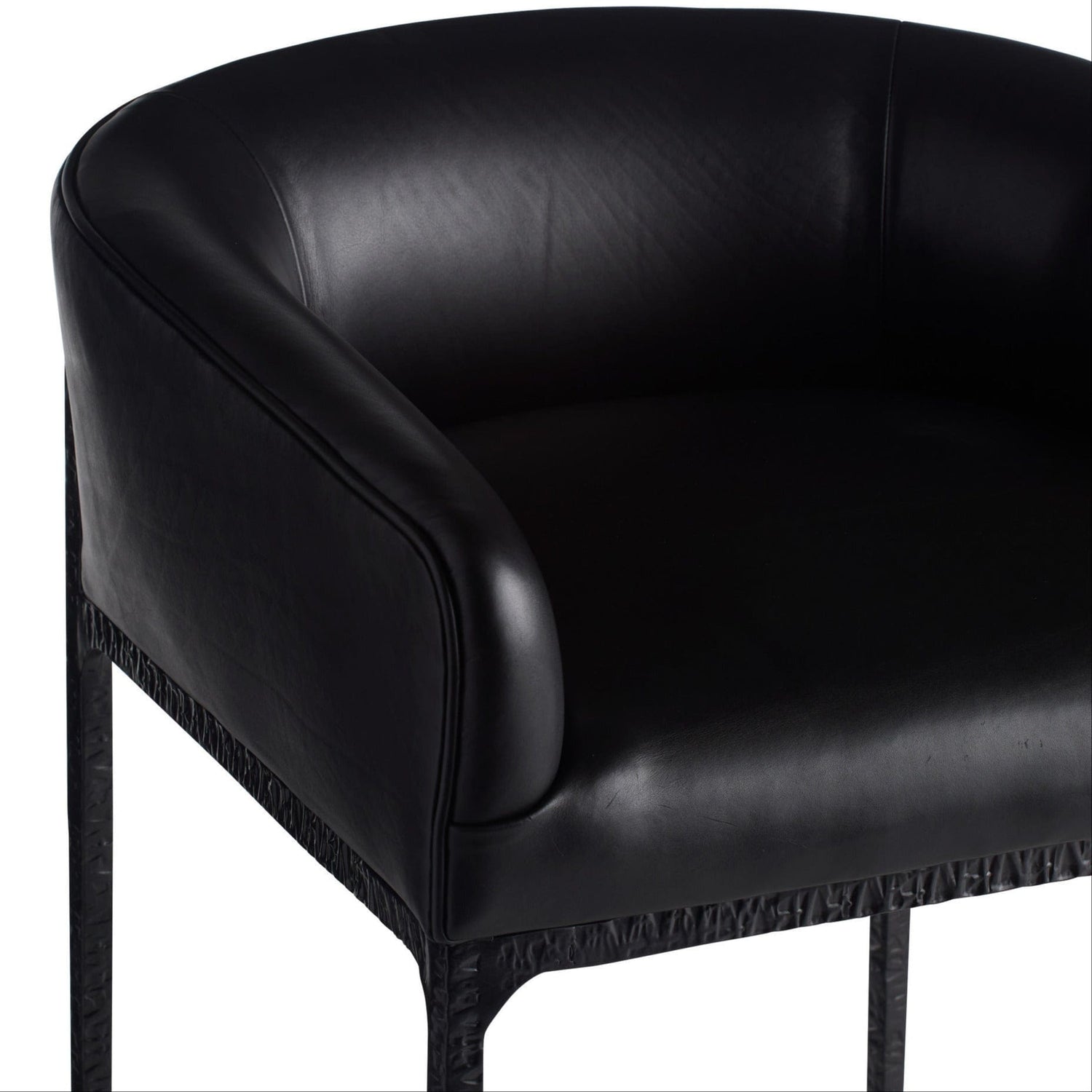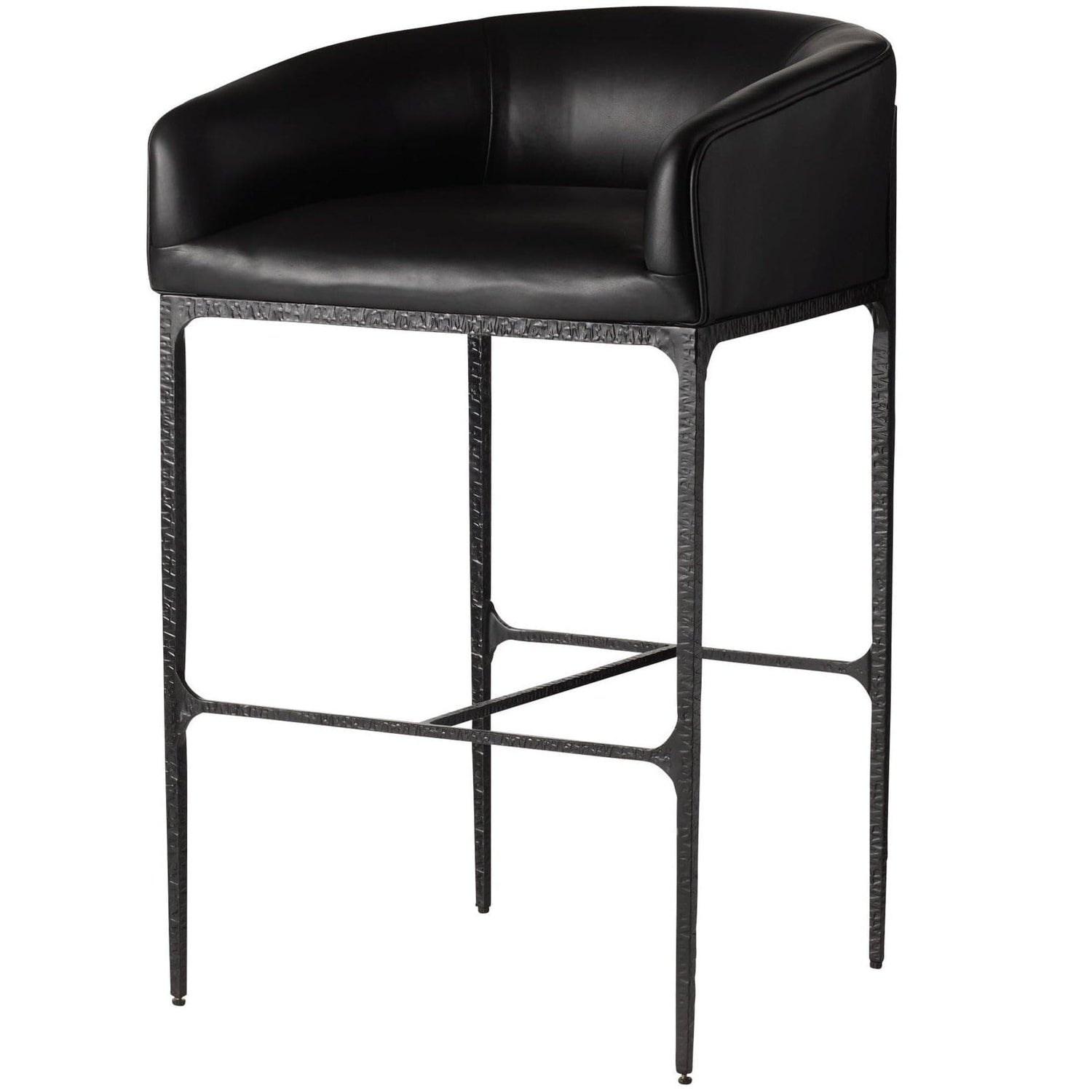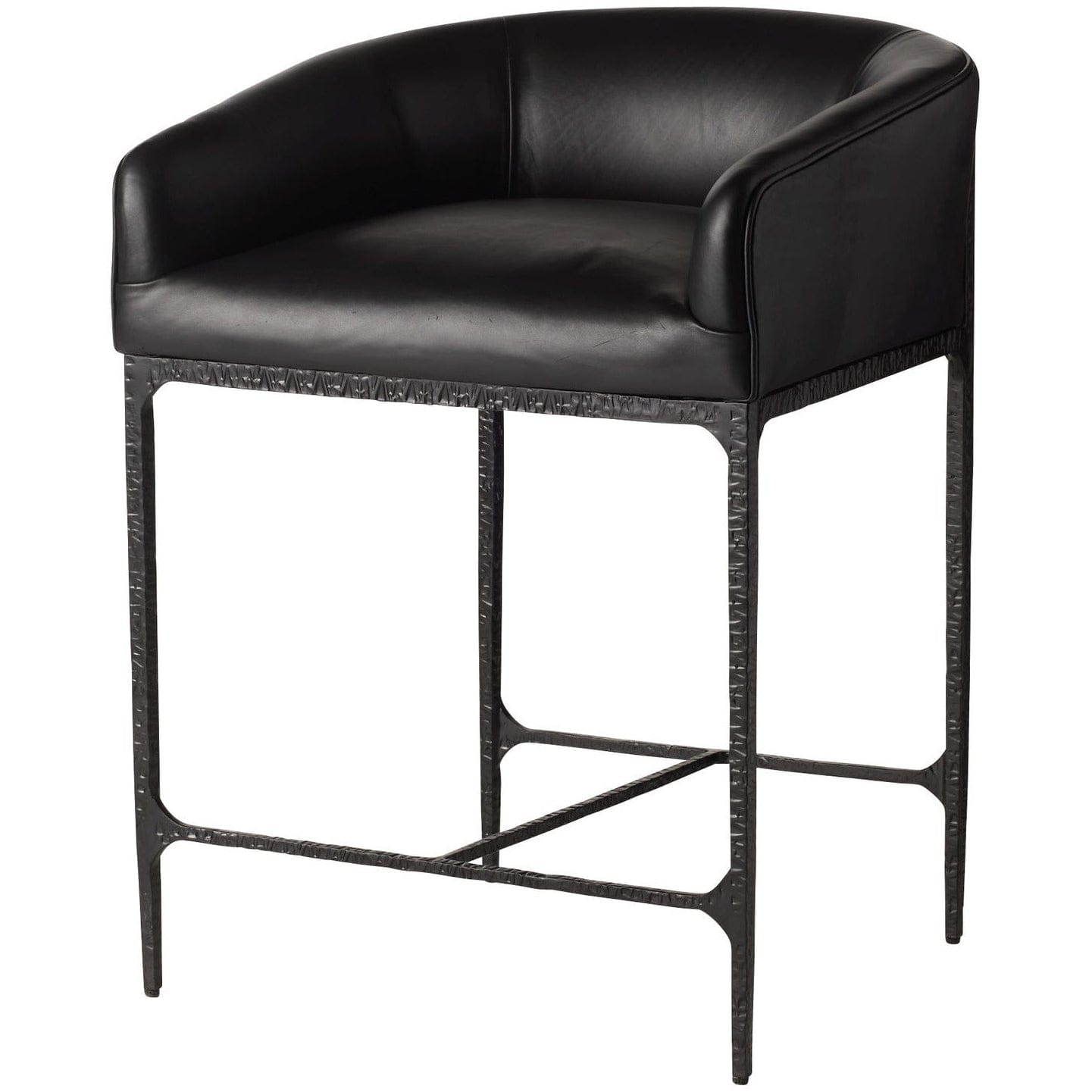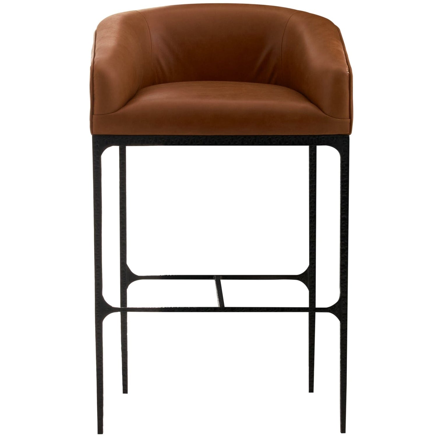 A hammered iron frame and handsome leather make this bar & counter stool ultra-chic. The low, barrel-style shape gives lumbar comfort and support while allowing the stool to tuck neatly under a bar or countertop. Its modern style brings sophistication and polish to a space. Leather and finish will vary.