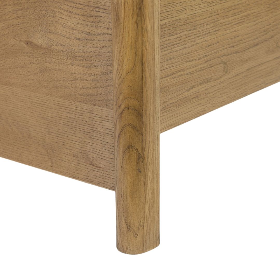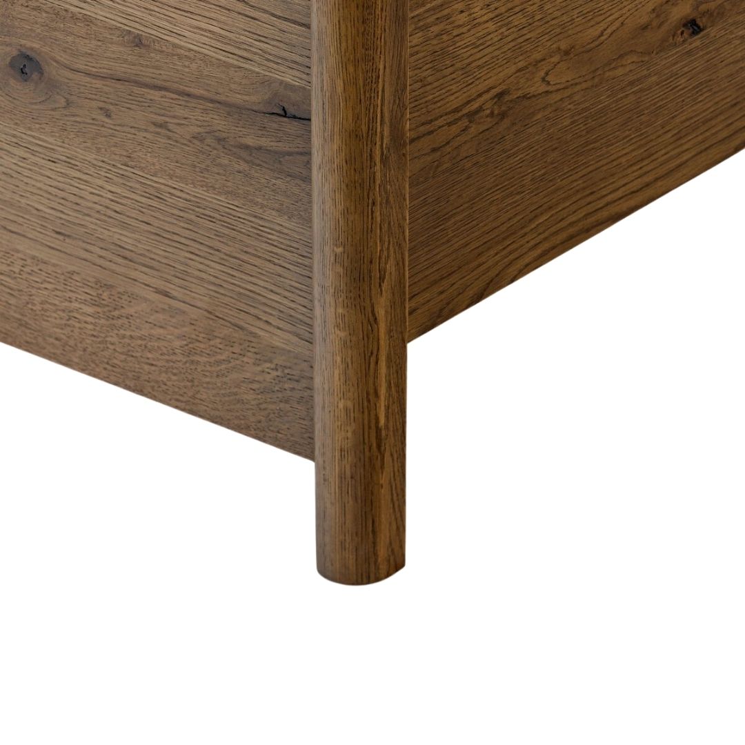 A heritage-inspired bed features soft curves and intricate carving along a rustic oak frame. A light, linen-upholstered headboard brings a touch a warmth to bedroom styling. Performance fabrics are specially created to withstand spills, stains, high traffic and wear, ensuring long-term comfort and unmatched durability.