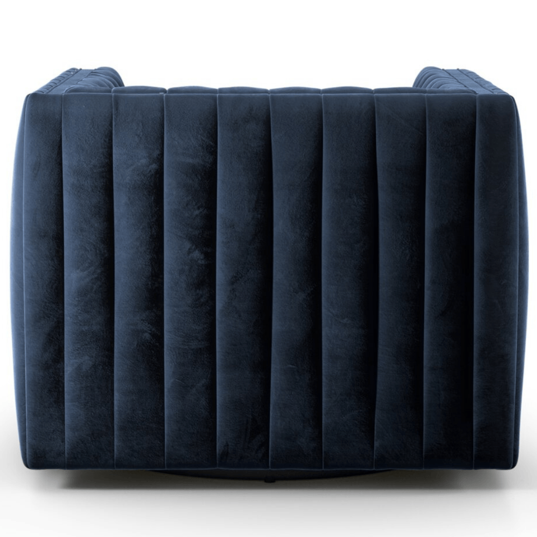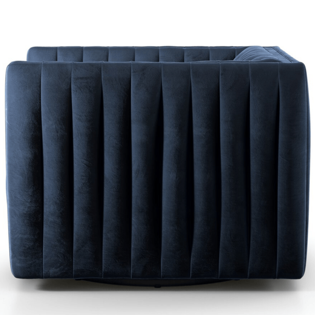 A modern take on the classic library chair, luxurious, Italian-inspired seating features dramatic channeling for trend-forward texture and a sumptuous sit. A 360-degree swivel delivers fresh appeal from every angle.