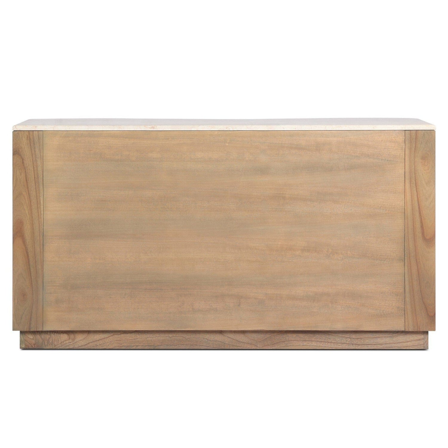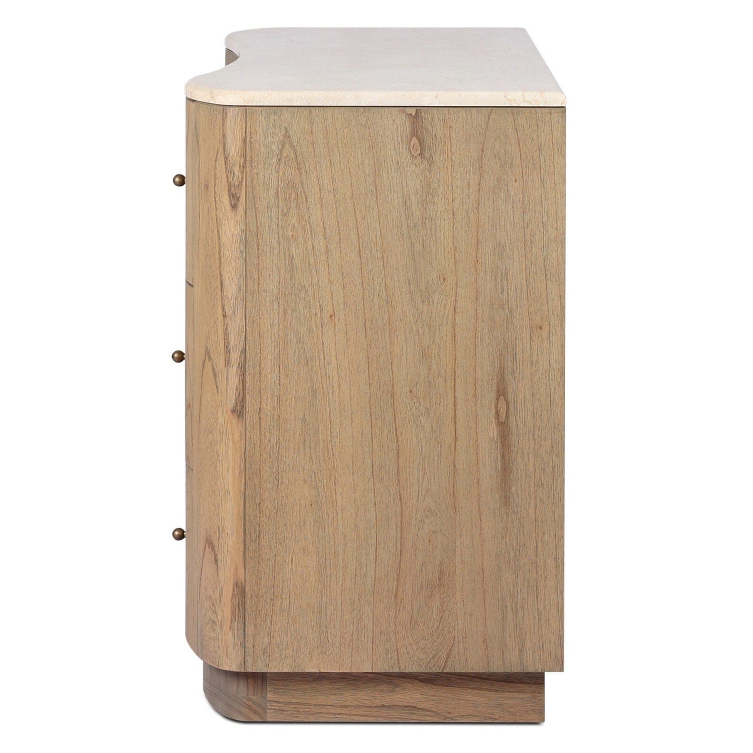 Fluid contours give shape to this solid mindi dresser, topped with a creamy marbled top. Six drawers with knobbed pulls open to spacious drawers.