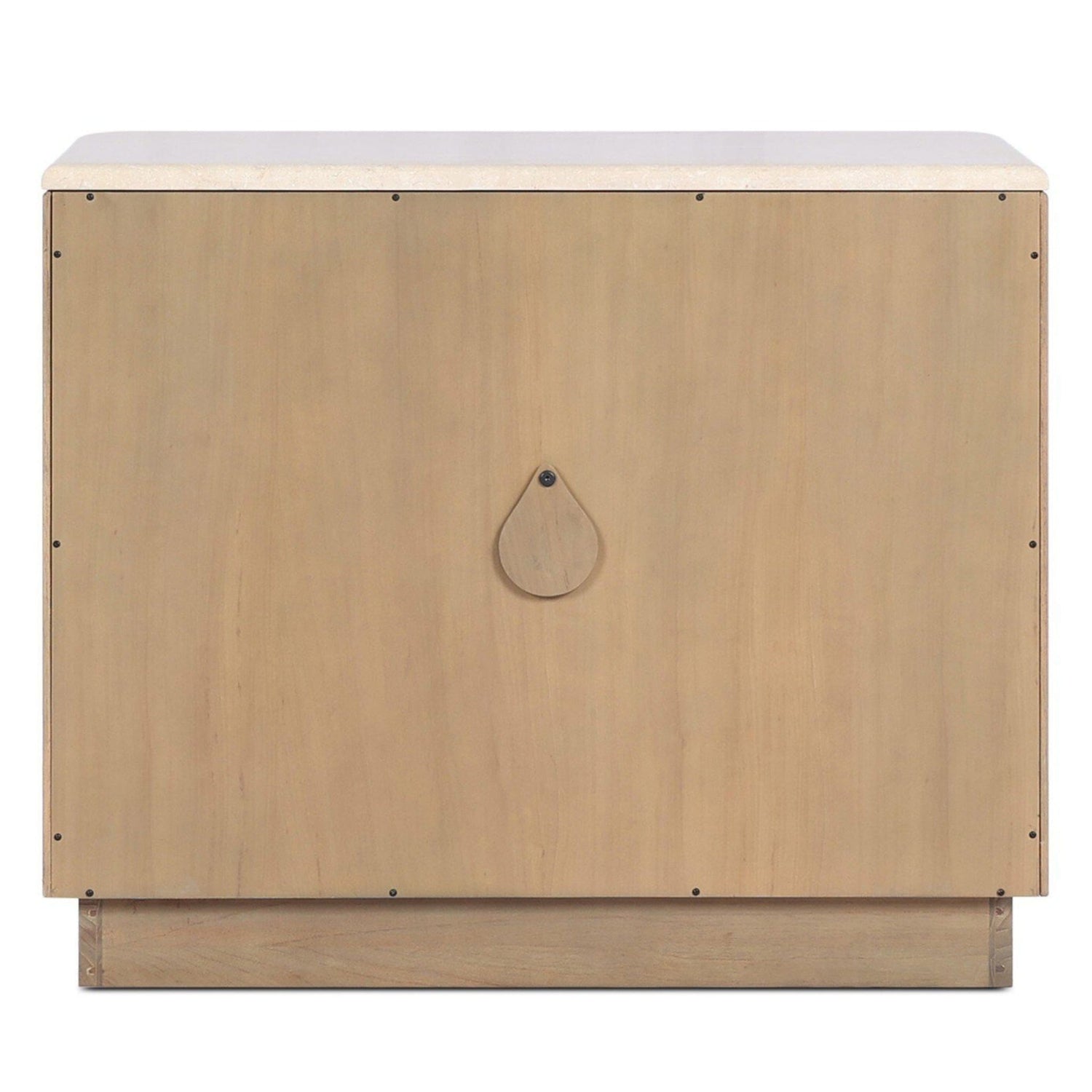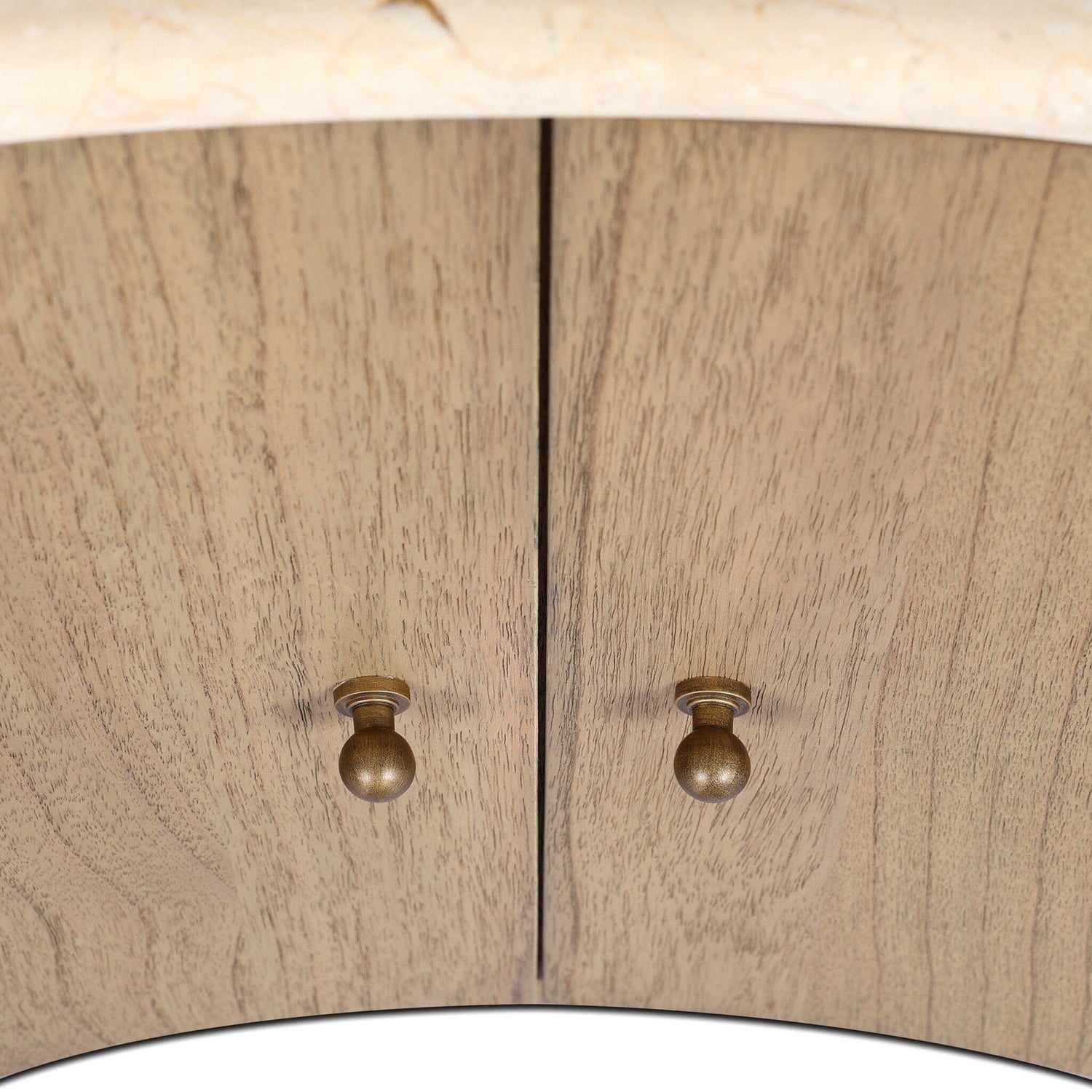 Fluid contours give shape to this solid mindi nightstand, topped with a creamy marbled top. Two doors with knobbed pulls open to inset shelves for organized bedside storage.