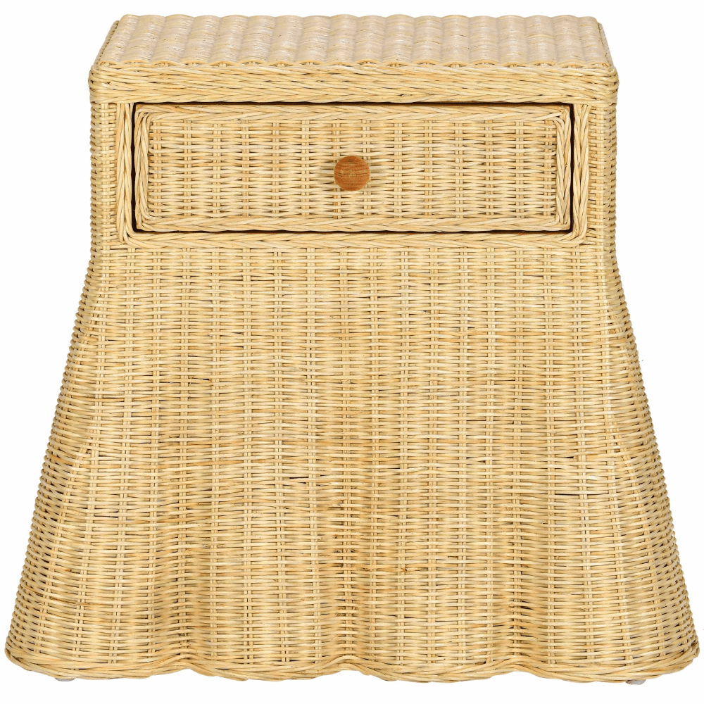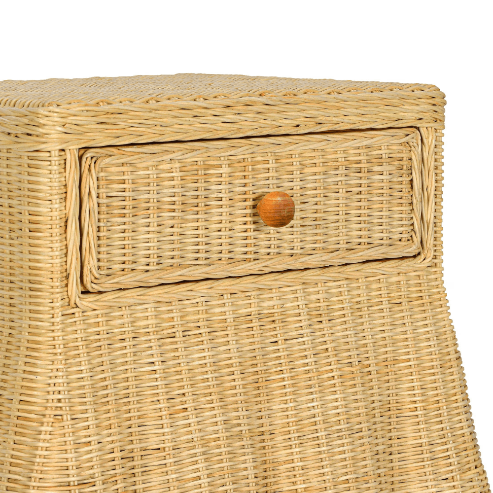 The Donna Nightstand charms with a handwoven rattan frame, solid wood knob, and a softly skirted base. With a felt-lined drawer and smooth glide rails, it's a dreamy blend of cottage-core whimsy and everyday function.