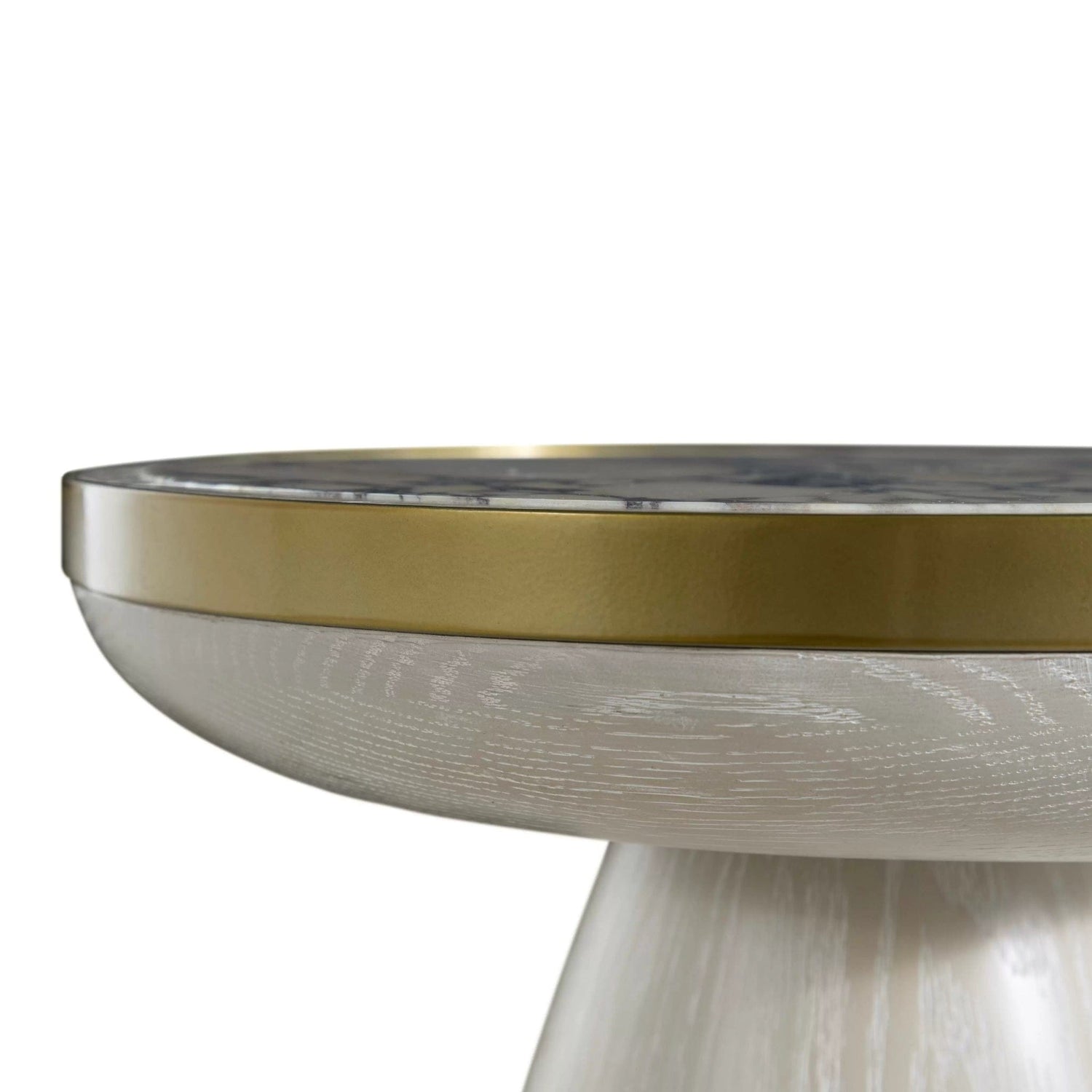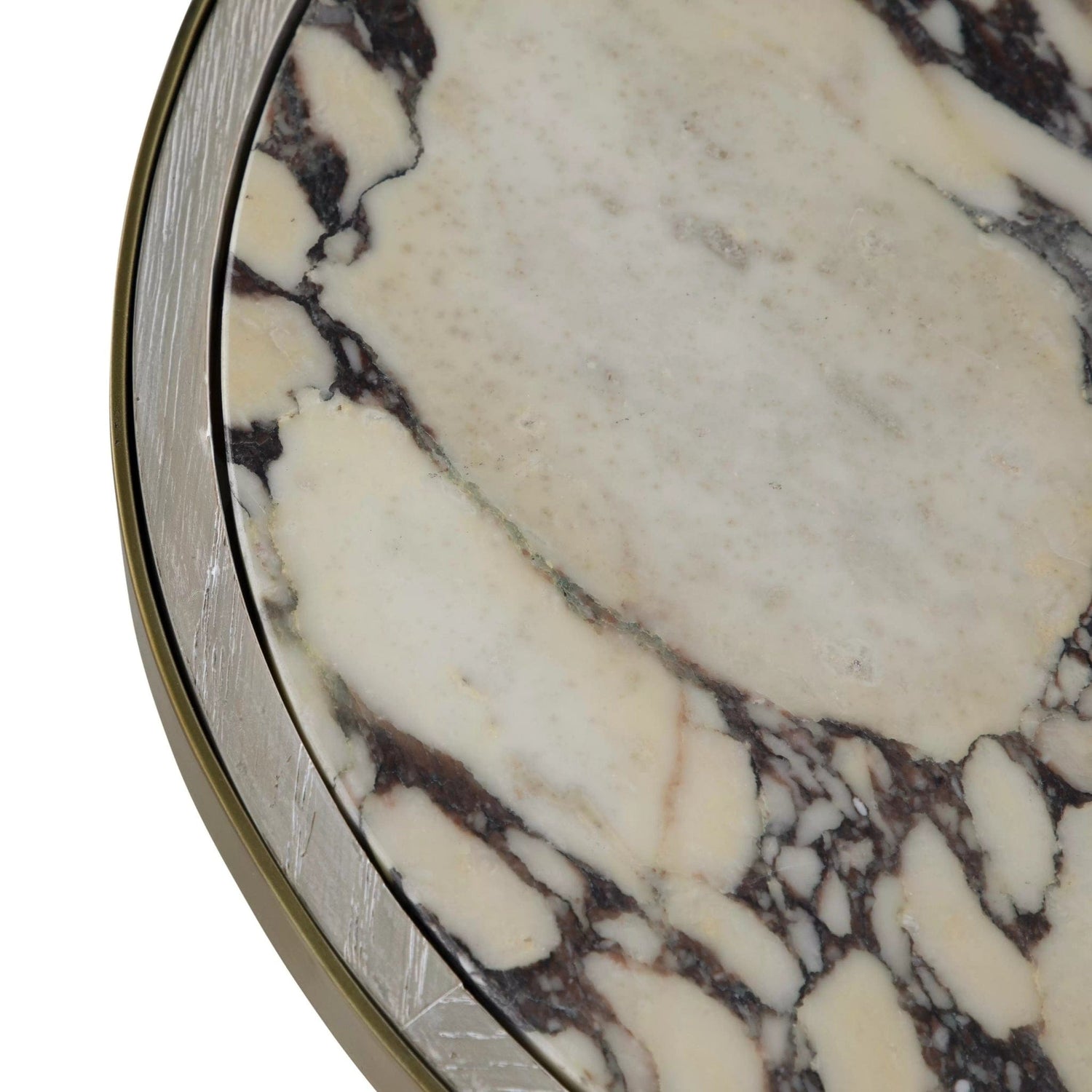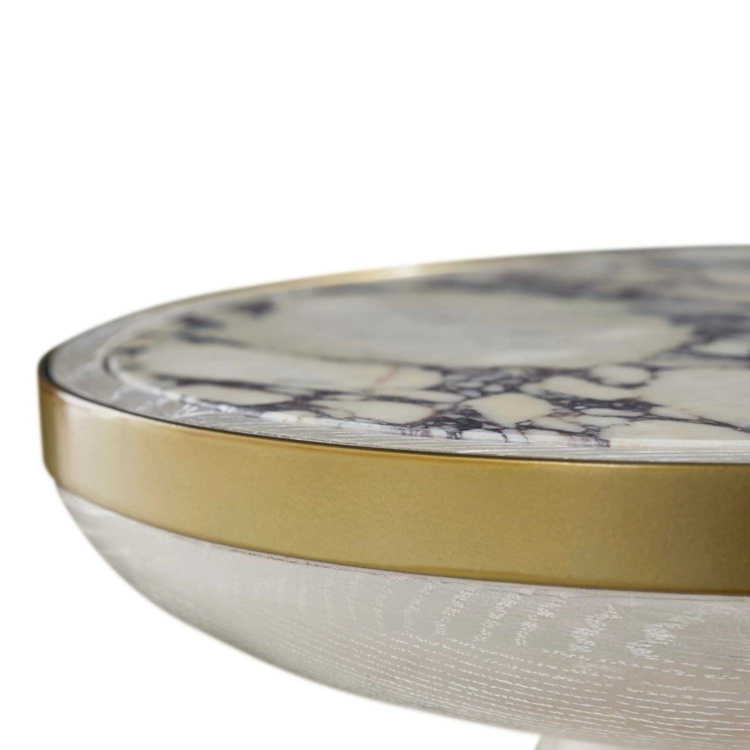 The Cain Side Table in White Cerused Oak is a masterpiece of modern Italian elegance Topped with exquisite Calcutta Viola marble its soft white surface is beautifully veined with deep organic patterns creating a striking yet refined aesthetic The antique brass band encircling the edge adds a touch of timeless glamour while the sculptural base in a genuine white cerused oak veneer brings warmth and sophistication A true fusion of natural beauty and contemporary design this table is a statement of effortless luxury for the stylish home