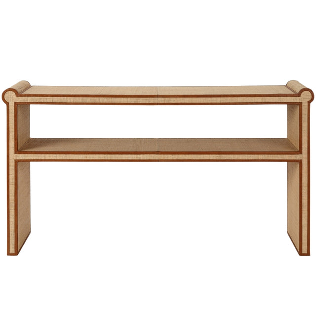 Our Matthew is crafted from raffia and instills a stately presence. A full-grain leather trim outlines the unique shape of the console. Given the nature of the material, variations and slight irregularities in color, fraying, patterns, and weaves may occur.