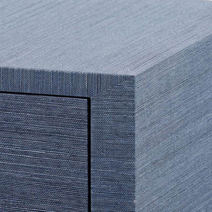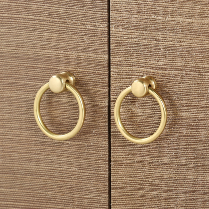 A sophisticated piece for any of your storage needs, the Meredith Extra Large 4-Door Cabinet brings handsome tailoring and luxurious finishes to a study, dining room, or home entertainment area. Its classic silhouette finds a dash of decorative refinement in its base, which features delicately curved Chow-style feet and an inset edge that adds dimension to its solid, elongated form. Four doors make up its facade, adorned with glittering gold finish ring pulls. Inside, four fixed shelves, richly stained, provide generous space for glassware, linens, or toys. The Meredith is also ideal for neatly arranging electronics, with two back openings for cables and wires. This piece is finished in lush, lightly textured lacquered grasscloth—a signature design detail showcasing Villa & House’s high-end craftsmanship.