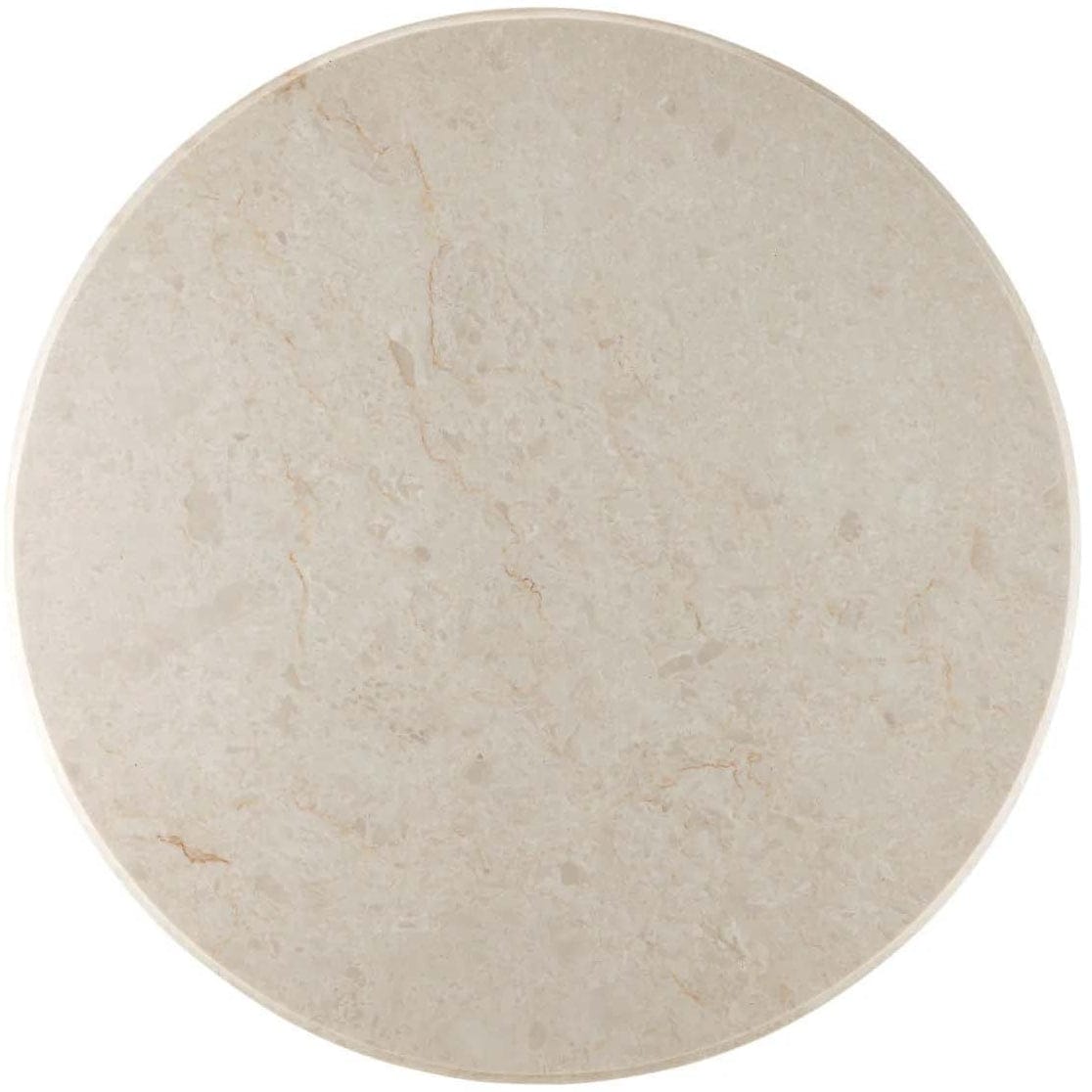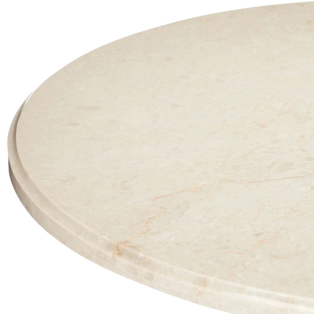 The hand-carved wood base of the Tassel Entry Table is a study in movement, with its flowing lines that imitate strands of thread. The Mindi wood from which it is made and the brass collar in a brushed brass finish bring the wood accent table warmth, while the Crema Marfill marble top is a nice contrast in its paleness.