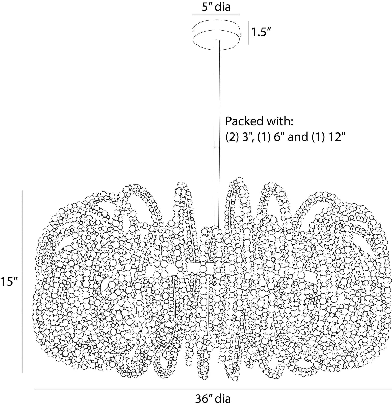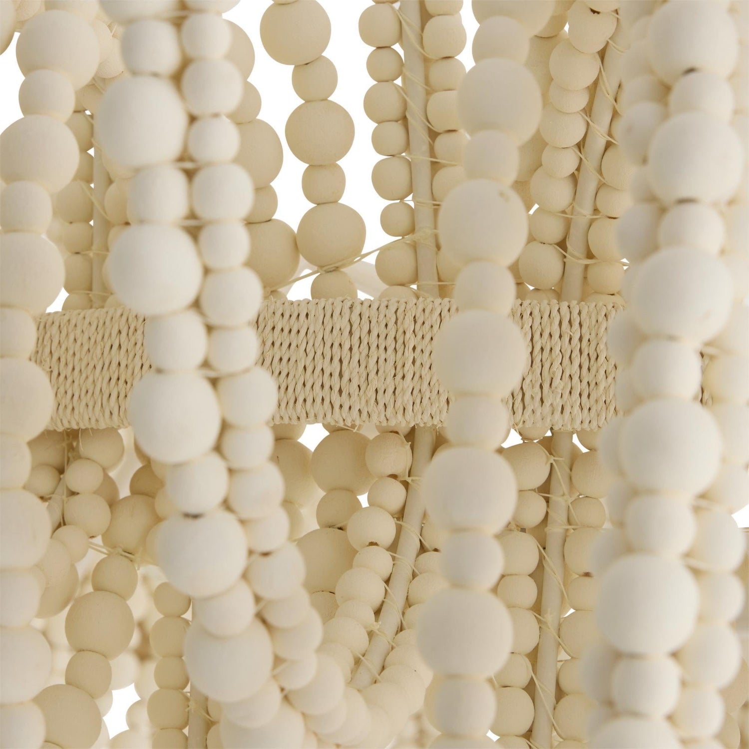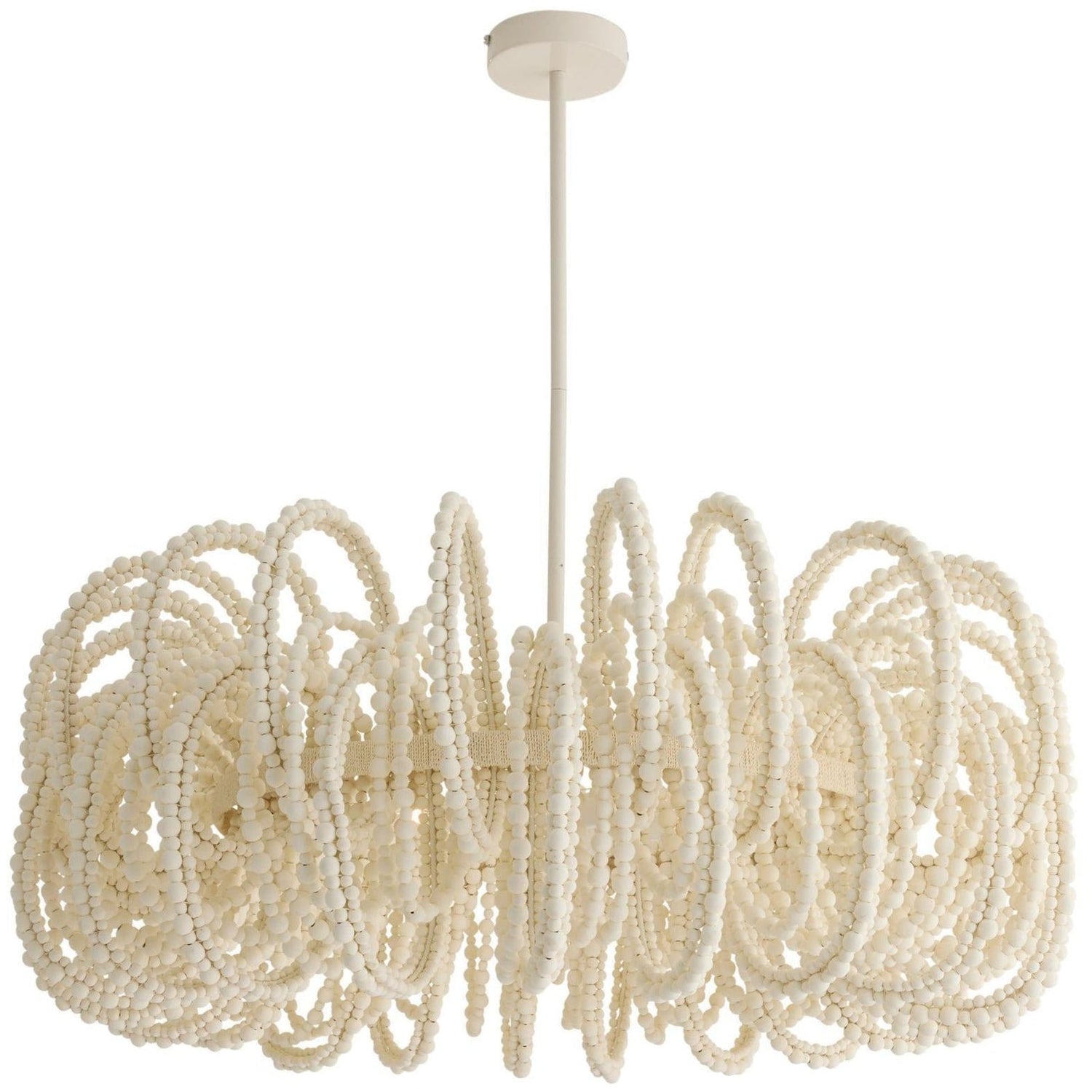 The silhouette of a sinuous sea creature swimming through the waves inspired the loops and drapes of our white wood fixture. The repetition of each beaded loop creates texture and movement from every angle. A white iron pipe and canopy anchors this whimsical feature. Finish will vary.