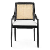 The regal stature and refined curves of our Veronika Armchair lend it an upscale elegance, while glossy finishes and organic materials keep it feeling modern and relaxed. We say it brings the best of both worlds to a dining room or kitchen, blending handsome sophistication with contemporary cool. Its sleek silhouette nods to the styling of mid-century modern designs, with sloping armrests, gently curved back legs, and uniquely tapered proportions. A lacquered mahogany frame in white or black provides a light contrast to the back panel of natural cane, giving the seat an airy, beachy presence. Finished with a plush, upholstered drop-in cushion, the Veronika serves as the chicest seat in the house.