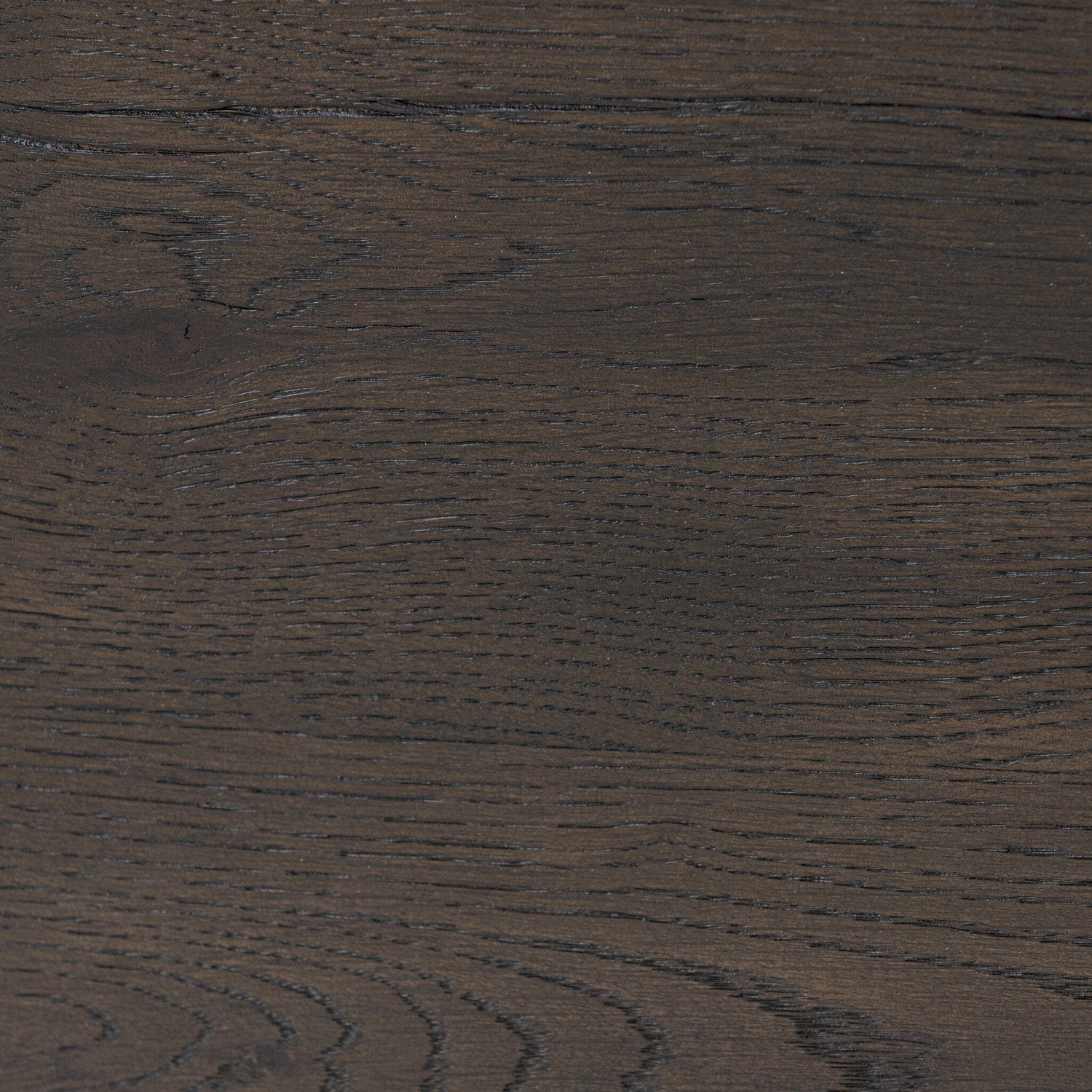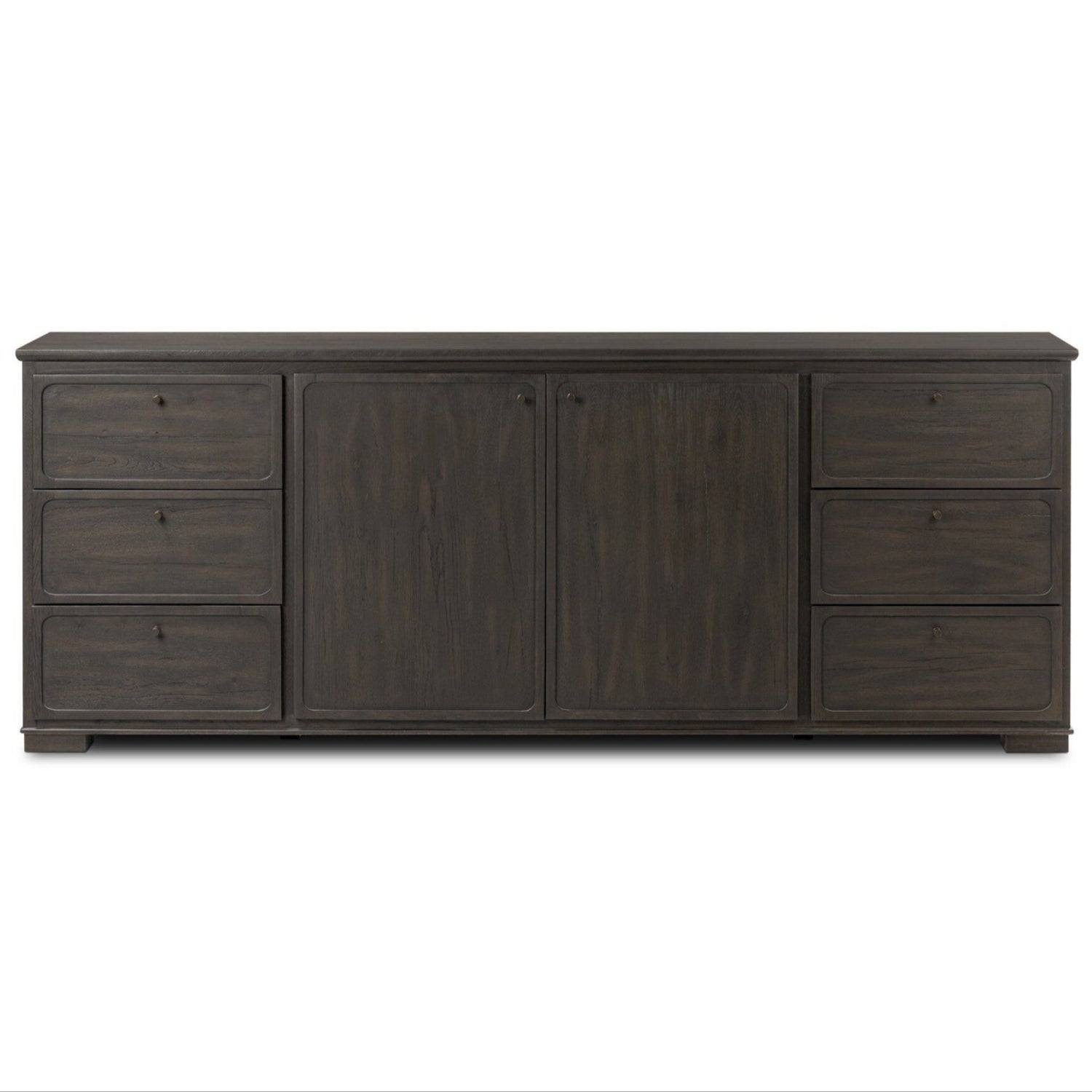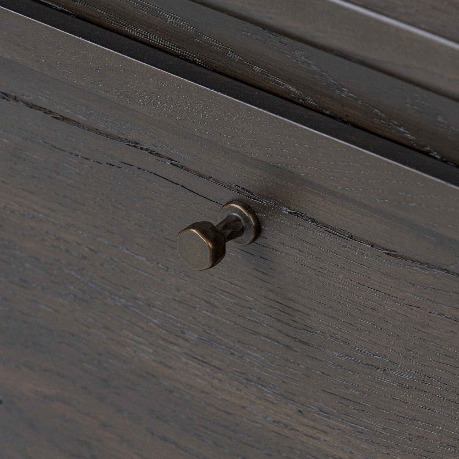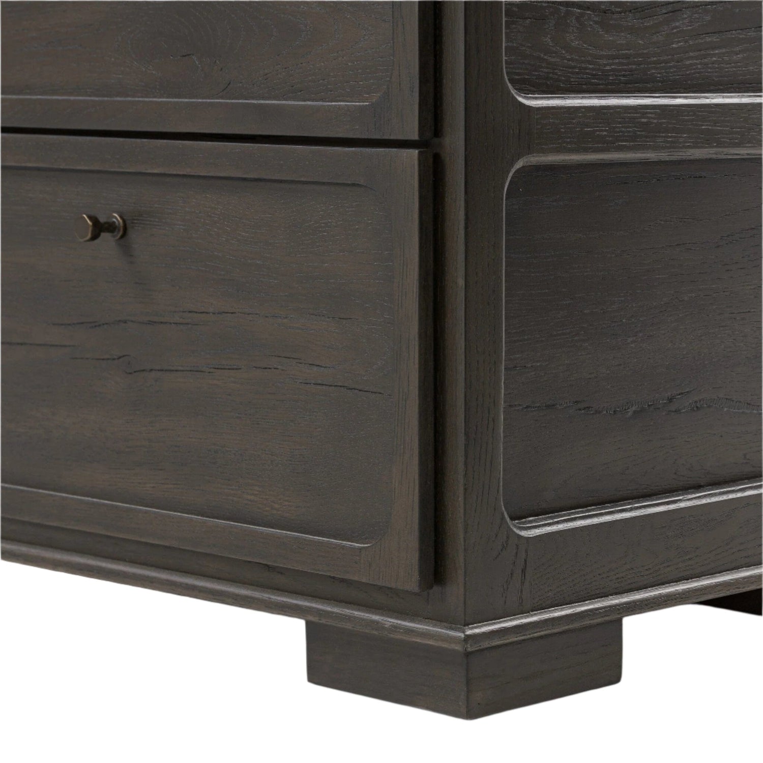 Modern Deco style meets a strong, traditional aesthetic. Each side has three drawers with rounded molding and hammered hardware, while a black oak finish with brown undertones reveals the wood's natural grain.