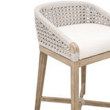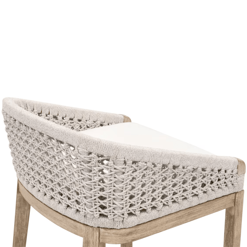 The Montecito Counter Stool by Essentials For Living offers a contemporary take on coastal style, perfect for transitional spaces. The handwoven white speckle rope seat adds a unique textural element. The fixed seat cushion is upholstered with high-performance LiveSmart Peyton-Pearl fabric, which makes cleaning easy. The legs are designed with extra support in mind, as it is crafted with an X-brace with rope detail at the center. The footrest features a metal cover to provide durability and support. This beach-inspired counter stool will be a lasting addition to any bar or dining space.