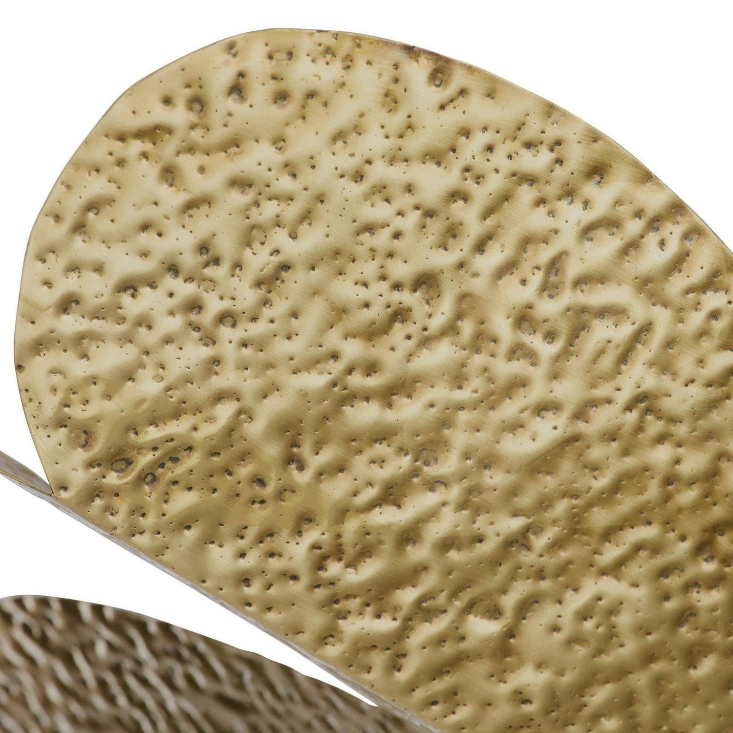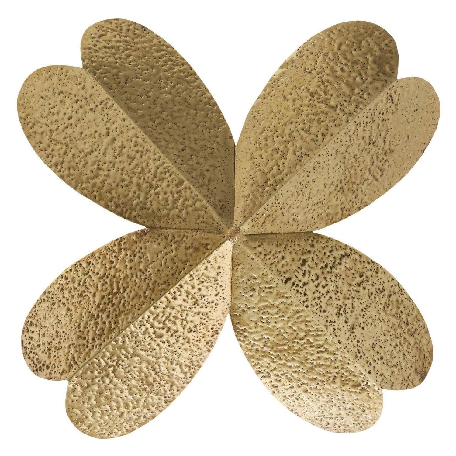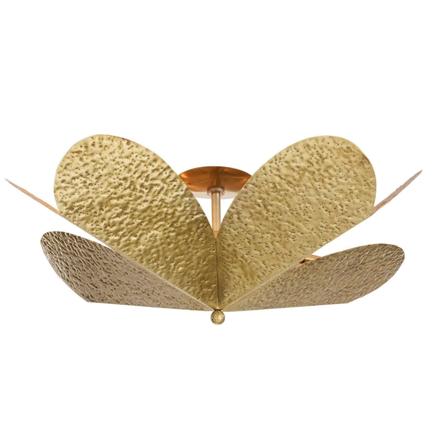 This textural antique brass flush mount casts light upward through its hand-hammered shades, reminiscent of delicate petals, creating a warm glow across the ceiling of an entryway, hallway, or small dining room. Suspended from an antique brass-plated iron pipe and canopy. Certified for damp locations and intended for interior use. Finish will vary.