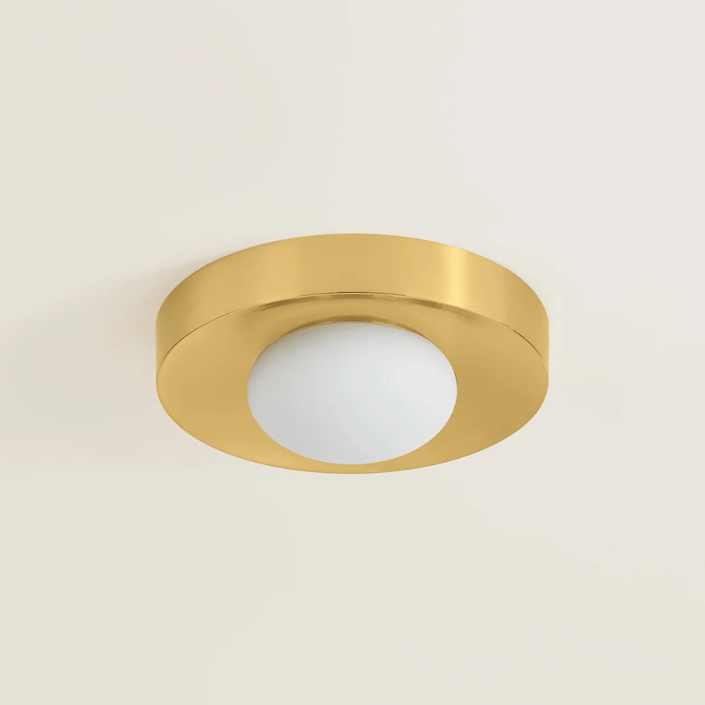 The embodiment of modern simplicity, Pepa uses pared-down Art Deco design motifs to create an accessible close-to-ceiling mount. Serving as a sleek reflector, the slightly concave Aged Brass canopy embraces a soft opal glass shade like a halo. The organic shaping of the matte glass shade offers a counterpoint to the gleaming metal, creating enough visual tension to catch the eye without overwhelming a space.
