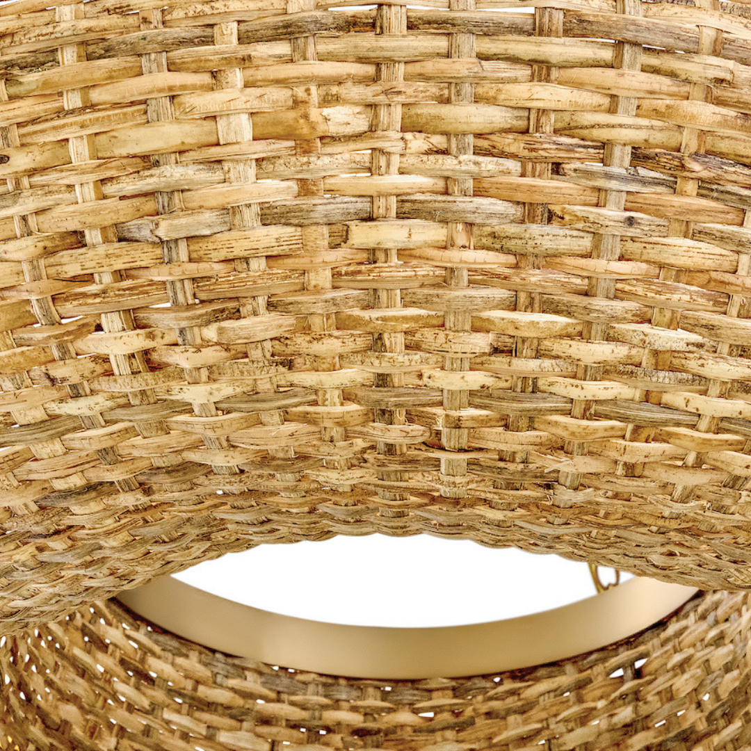 Polished details and inviting organic texture give Sanibel’s basket-woven natural paper shade incredible charm and elevated style. Chic metal trim and decorative chains accentuate the classic round silhouette, enhanced by a refined Lacquered Brass finish.