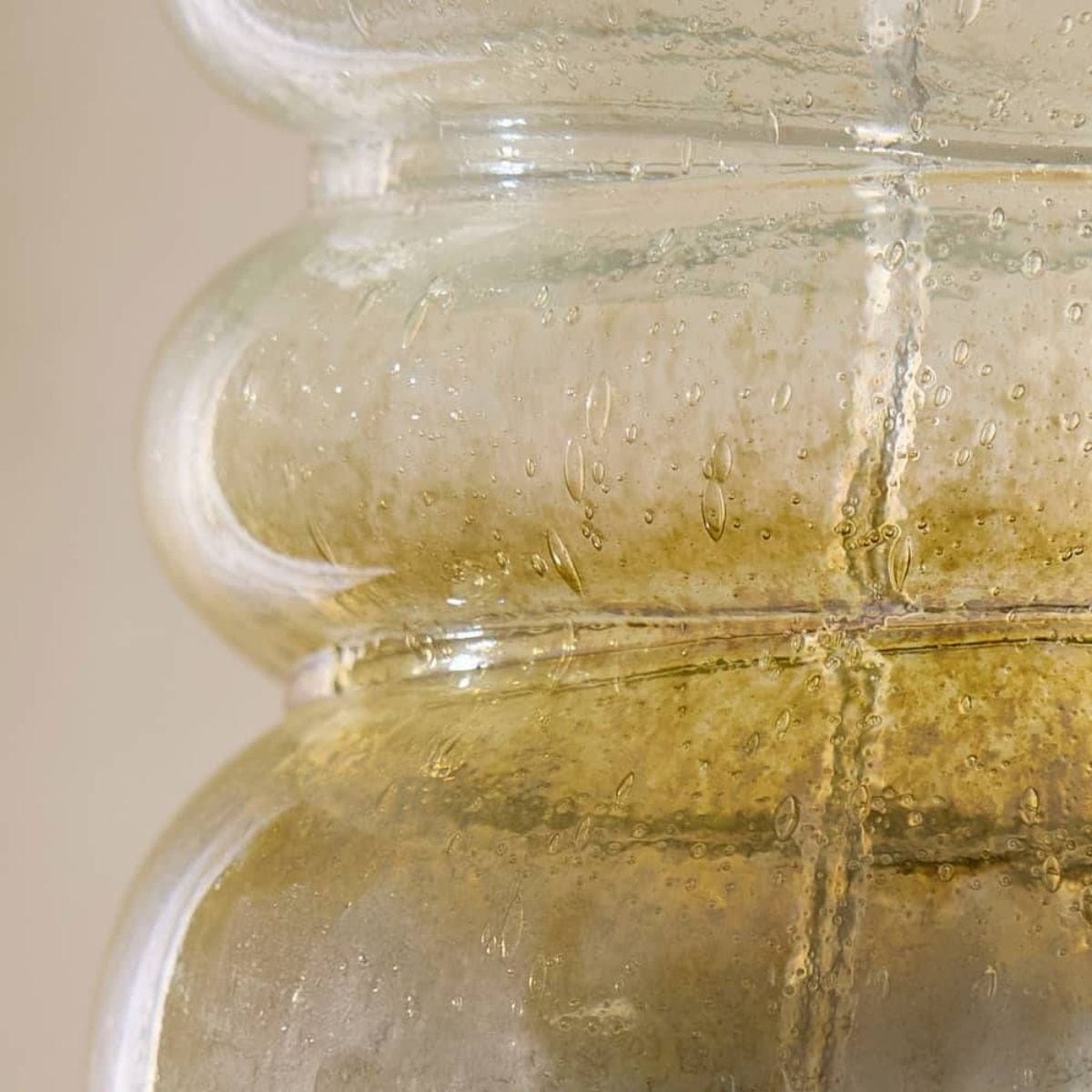 A stack of sculptural lucite bangles inspired the silhouette of our seeded glass table lamp. With an antique mercury ombre finish, the variation in colors and translucency draws the eye to its organic, asymmetric form. A neck of polished nickel-plated iron supports the off-white microfiber drum shade lined in matching cotton. Finish will vary.