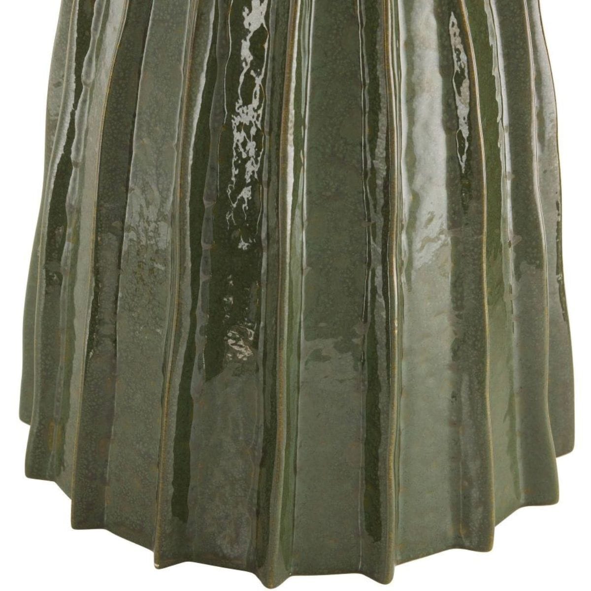 Inspired by the textured form of a cactus, this ceramic lamp features ridged surfaces glazed in a dark green reactive finish for mid-century modern appeal. Tall enough to balance an end table or credenza, it is accented with polished nickel-plated steel hardware and topped with an off-white microfiber drum shade lined in matching cotton. Finish will vary.