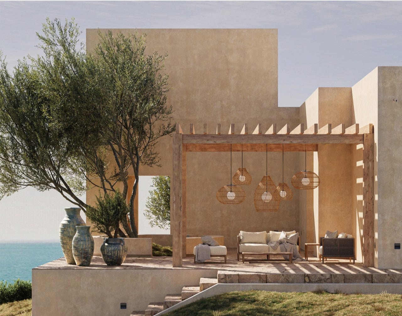 The crisscross pattern on the shade of the Bly Outdoor Pendant is made of all-weather wicker that can easily withstand the elements, as will the metal hardware in a black powder-coated finish. The intricacy achieved on the woven fixture makes the large-scale pattern very artisanal for an outdoor pendant. The single-light fixture is wet location-tested, which makes it ideal for lighting patios and porches, and the sophistication of the design will bring greater beauty to a large outdoor space when hung in multiples.