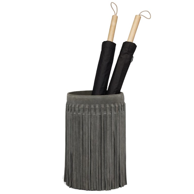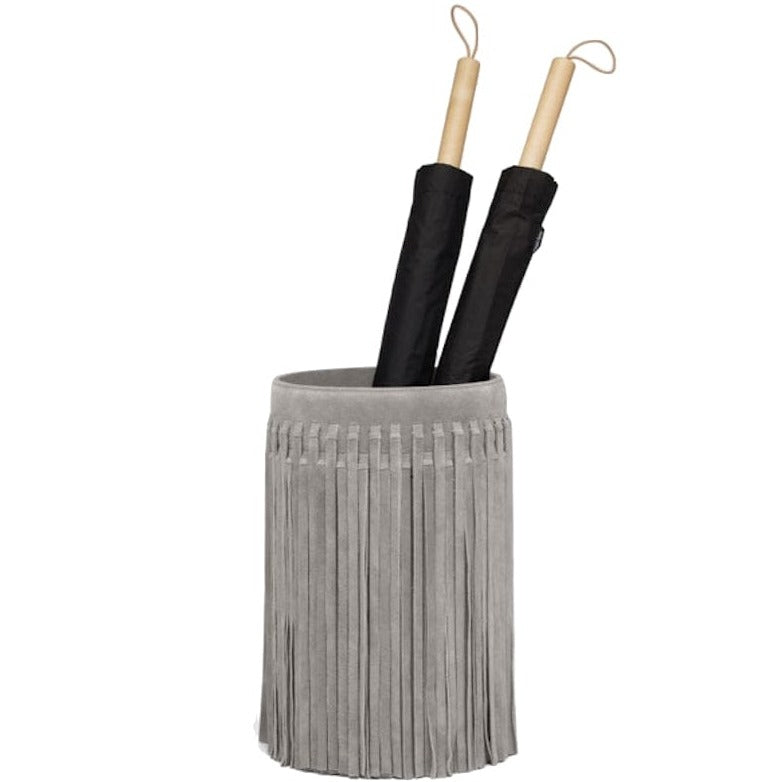 Playful fringe makes this suede umbrella stand more than just an accent piece. The interior is lined with chambray and a protective bottom tray insert is included.