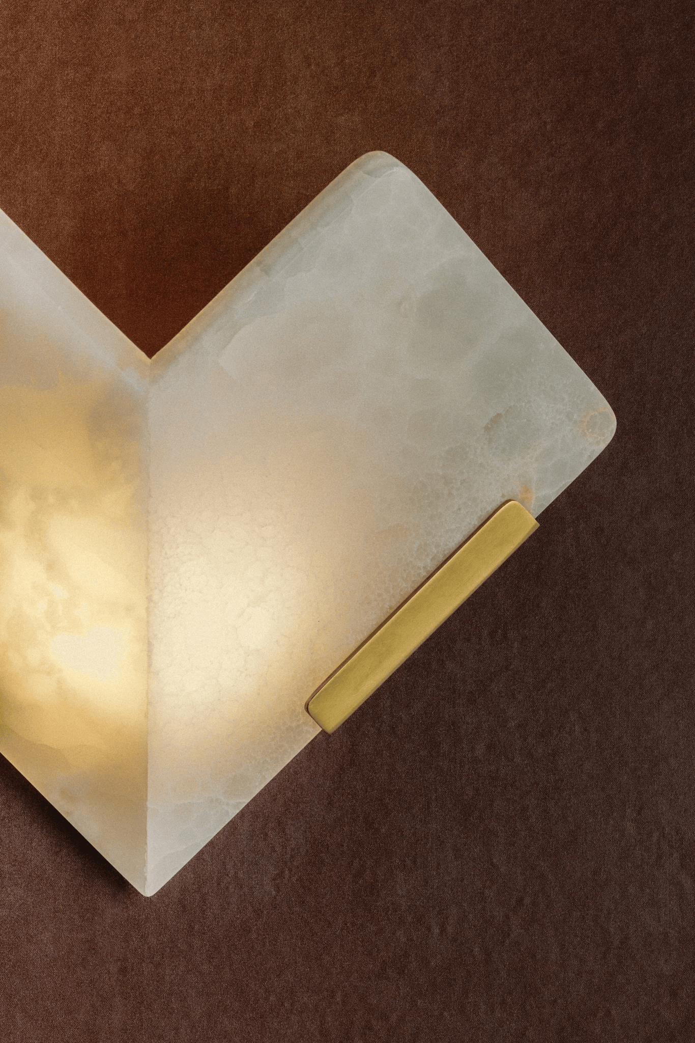 Geo is defined by its quiet strength and sculptural clarity. Glowing panels of honey onyx are book matched to reveal mirrored veining—an artisanal detail more often seen in luxury surfaces than lighting. The symmetry of the stone takes center stage, framed by clean, minimal metalwork in Vintage Brass that amplifies its natural elegance. Geo offers a soft, grounded glow that feels both bold and restrained. Its graphic silhouette and elemental beauty lend structure and visual rhythm to interiors.