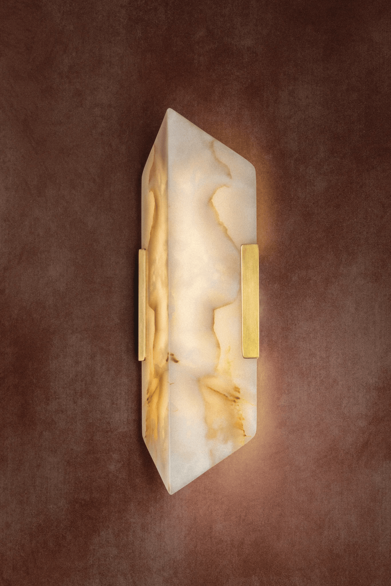 Geo is defined by its quiet strength and sculptural clarity. Glowing panels of honey onyx are book matched to reveal mirrored veining—an artisanal detail more often seen in luxury surfaces than lighting. The symmetry of the stone takes center stage, framed by clean, minimal metalwork in Vintage Brass that amplifies its natural elegance. Geo offers a soft, grounded glow that feels both bold and restrained. Its graphic silhouette and elemental beauty lend structure and visual rhythm to interiors.