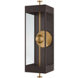 The Garvey sconce reimagines a traditional box lantern with a modern, artistic twist. A rod pierces vertically through the design, suspending a central bead that houses the LED light source. Behind it, a reflective panel amplifies the glow while adding a contemporary dimension. The interplay of the contrasting Textured Bronze and Patina Brass finishes creates visual depth.
