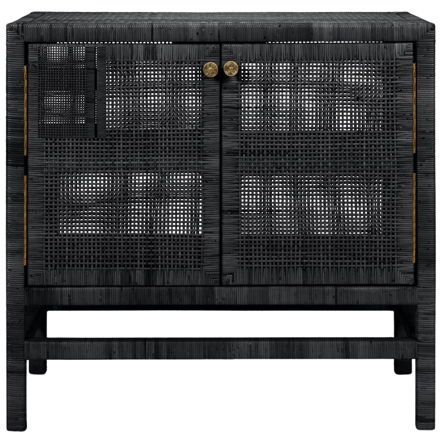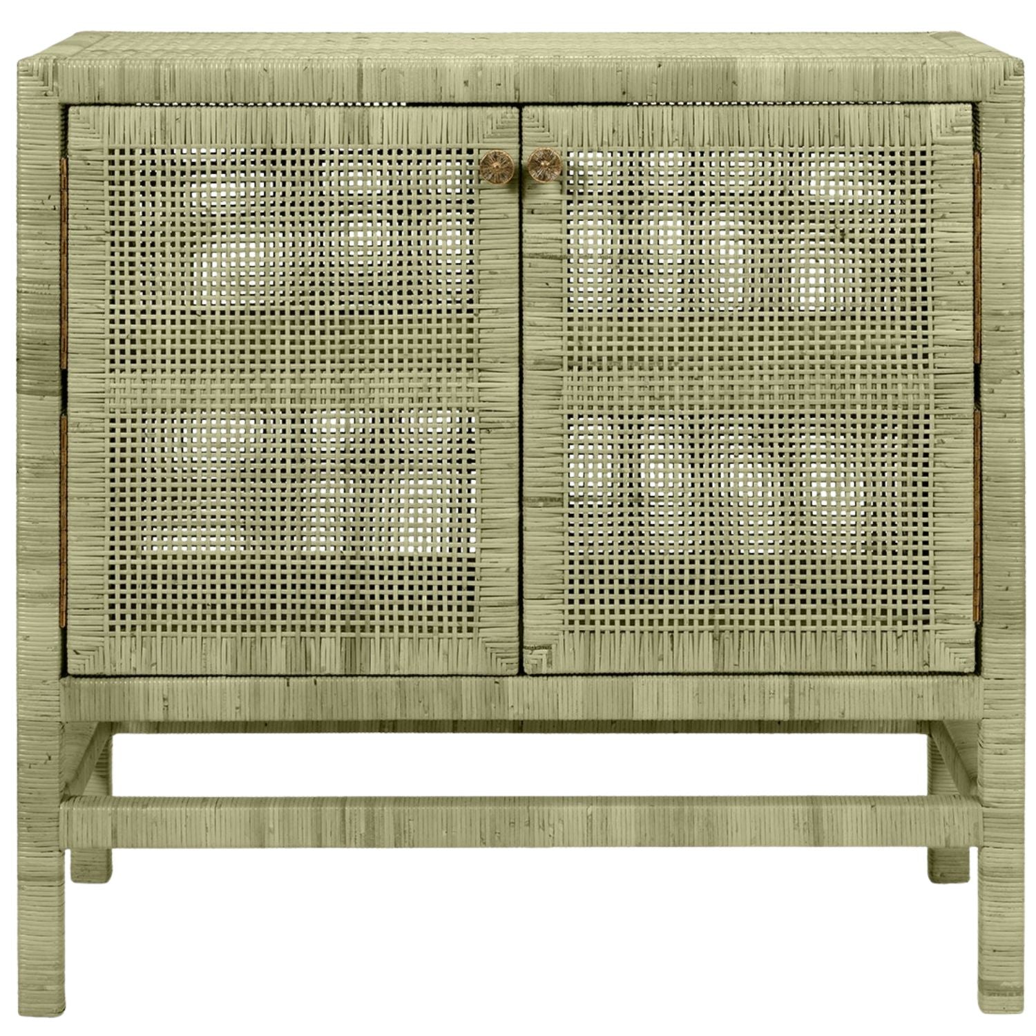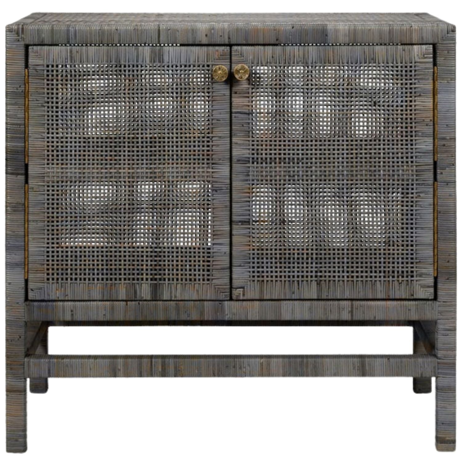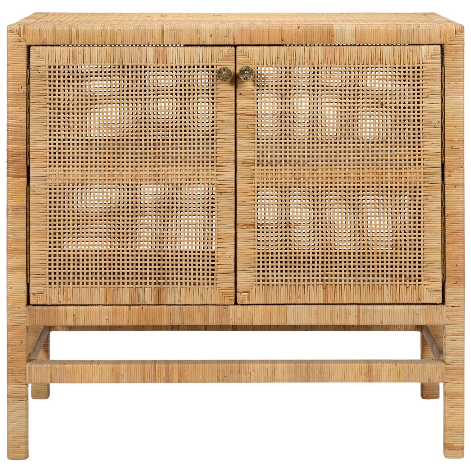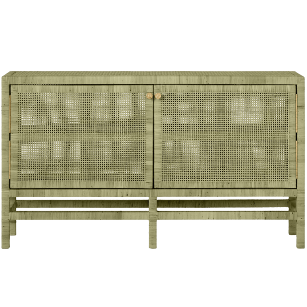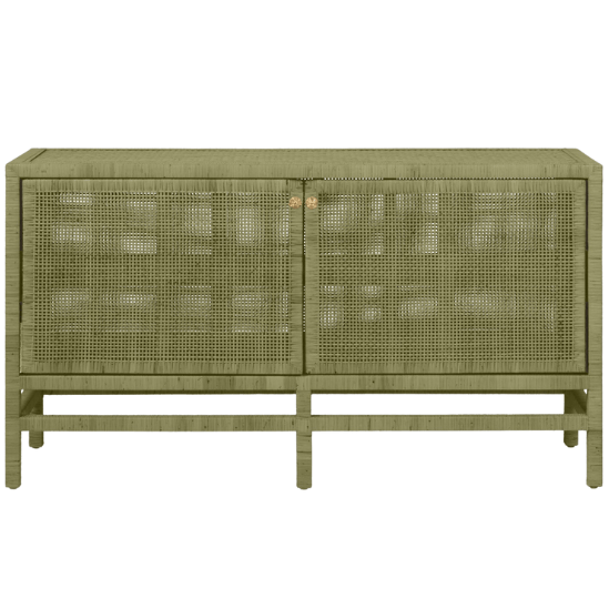 The Isla buffet stores dining room essentials behind rattan-cane doors, complete with fixed shelves and brass-colored knobs. This sideboard boasts a spacious surface above its doors and rests on stable legs. Natural variations should be expected.