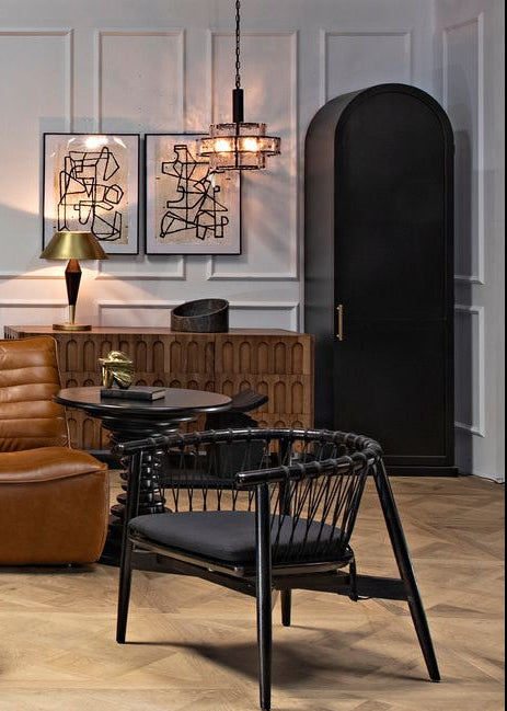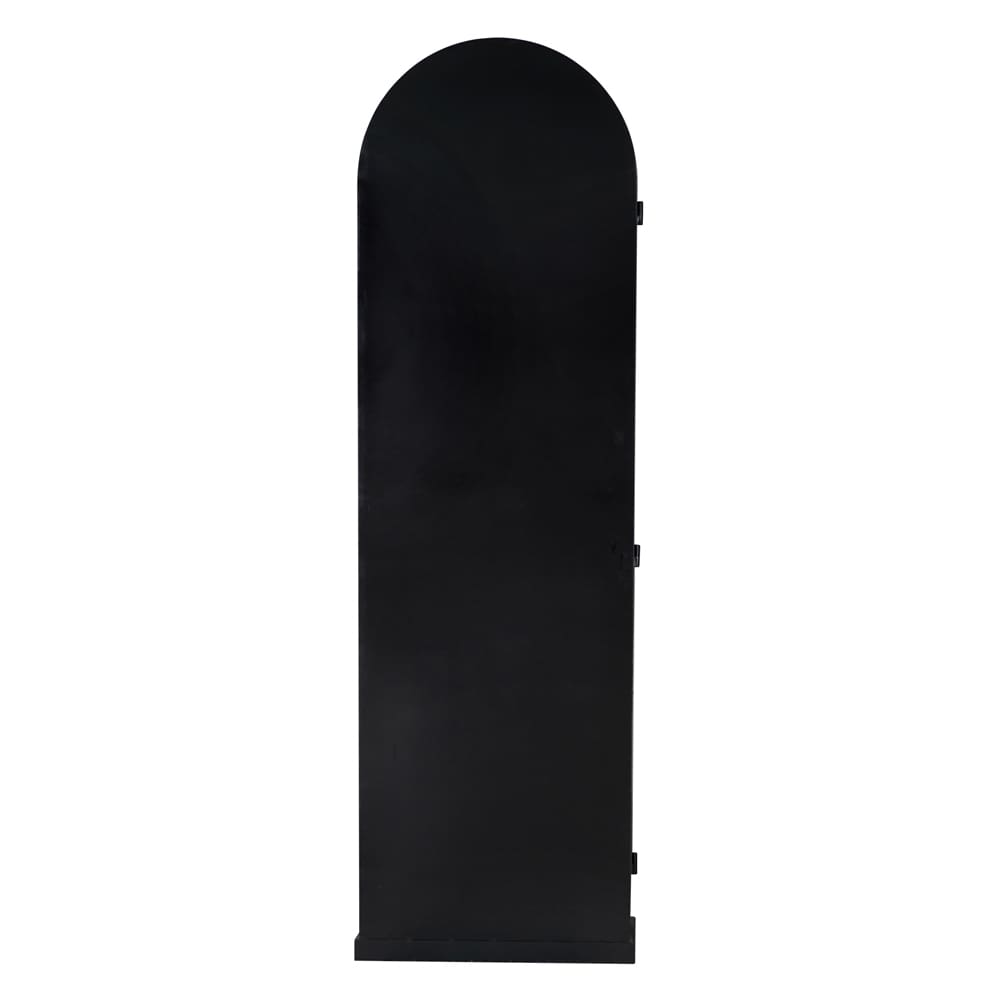 The New Tyrol Hutch Right features a matte black iron body complemented by warm wood shelves in an ebony walnut finish, creating a refined industrial look. Its open design offers versatile storage and display options for modern, minimalist interiors.