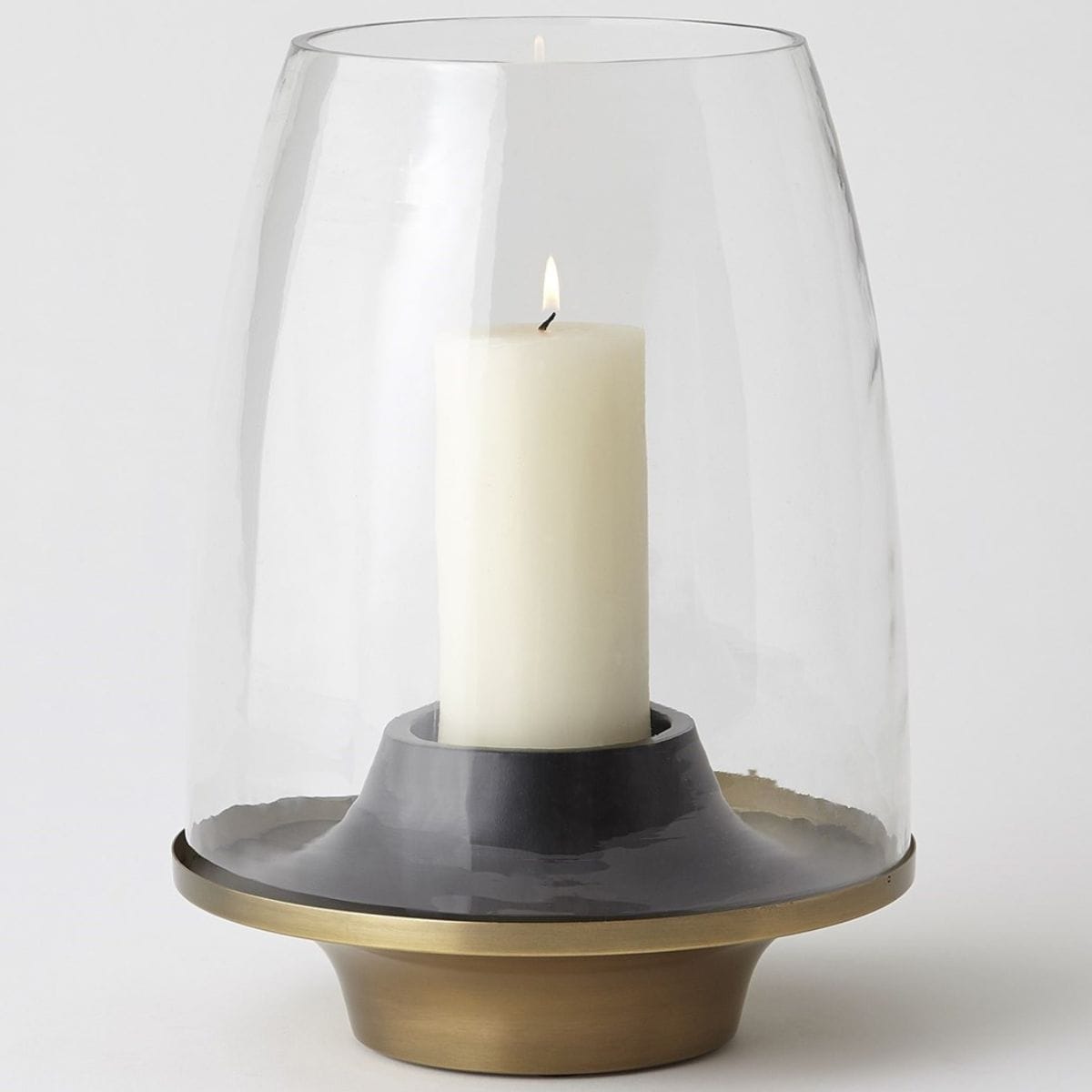 The Black with antique brass like Hurricanes feature a sleek, sophisticated design. A glass hurricane rests on a tapered iron base, finished in antique brass and black, adding an elegant touch to any setting.