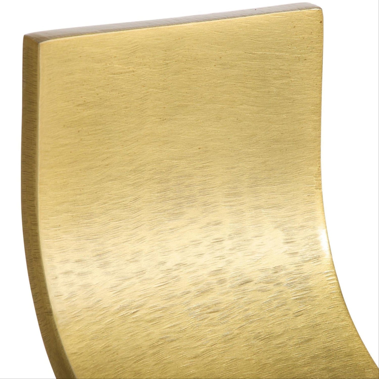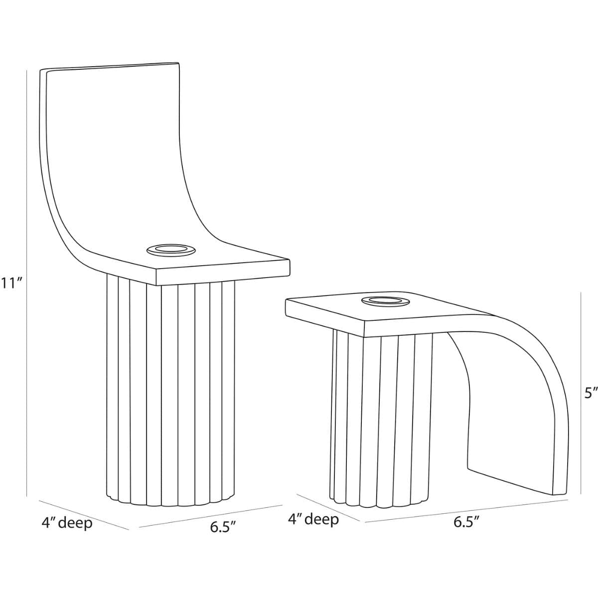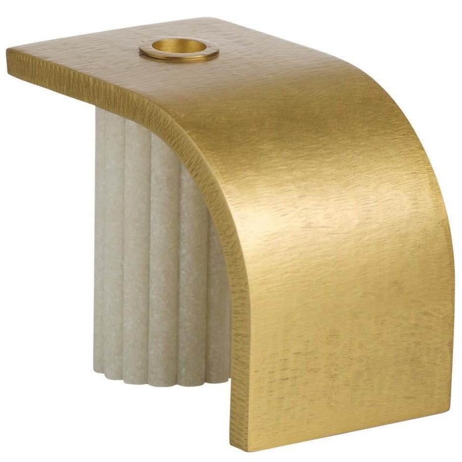 This staggered set, a modern twist on classical iconography, was informed by Greek columns and arches. Crafted of ivory ricestone composite, the pair securely holds a taper candle. Antique brass steel accents swoop in opposite directions, adding a dynamic look when displayed. Finish will vary.