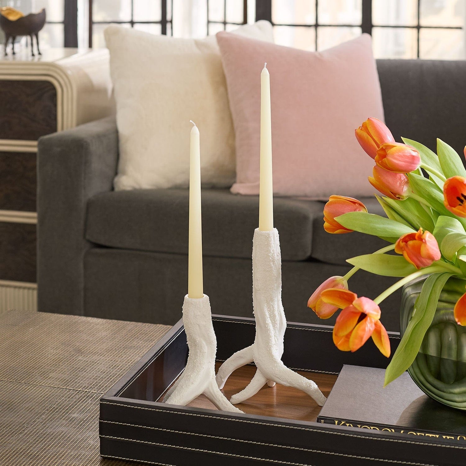 The Vinyeron Candlesticks Pair capture the organic beauty of branching vine roots with their textured, sculptural design. Their irregular shape, featuring multiple arms rooted firmly at the base, creates a striking visual appeal. Its matte white finish echoes the rugged texture of branches, adding a tactile element. Ideal for those who appreciate unique, nature-inspired decor, the Vinyeron Candlesticks merge modern artistry with organic charm.