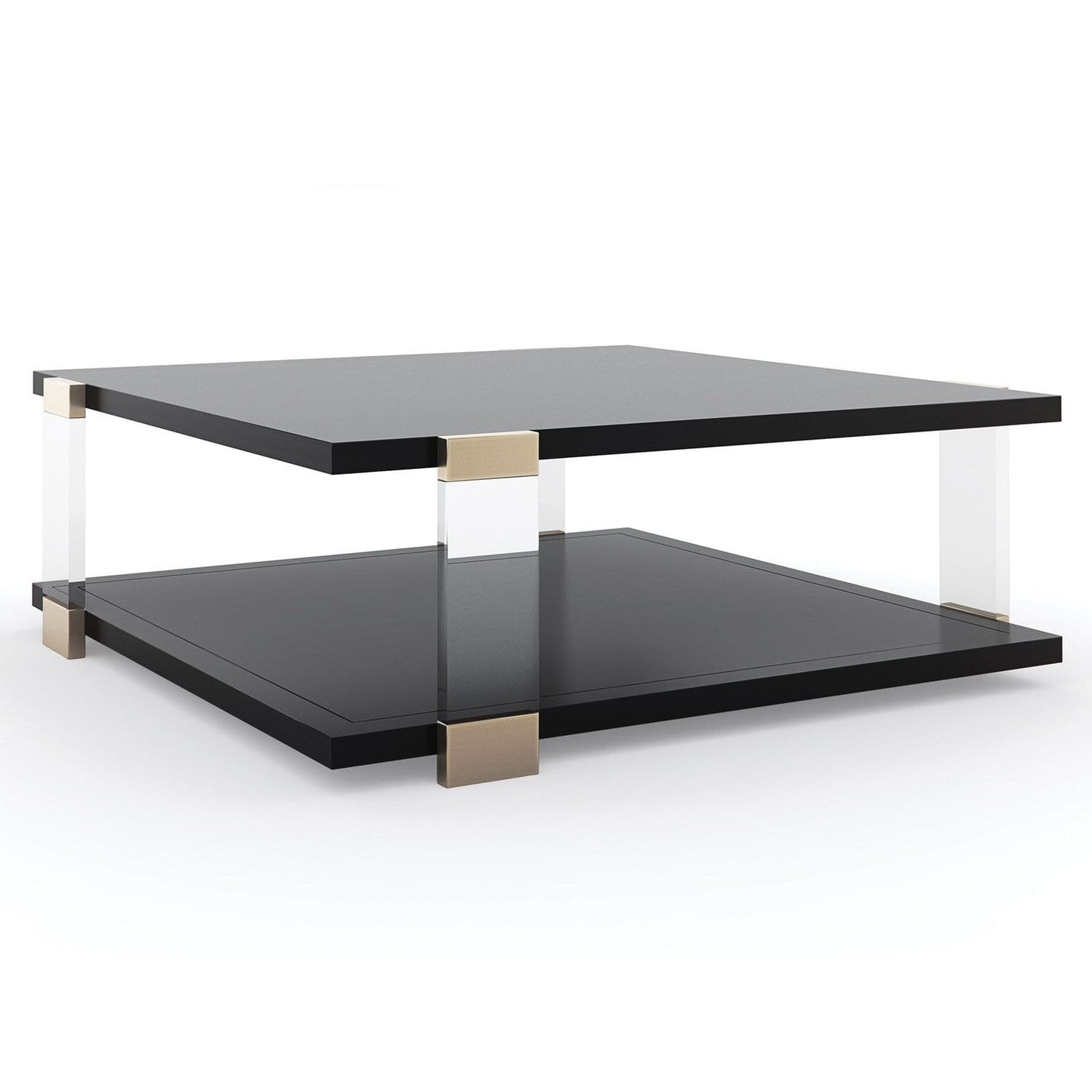 Instantly elevating, this square cocktail table brings a beautiful balance of light and linear forms. Its tabletop and shelf appear to float within clear acrylic posts, for a look that stirs interest, without imposing. Whisper of Gold metal accents create shimmer and moments for reflection. Centers a room, and offers ample space to style books and décor, above and beneath.