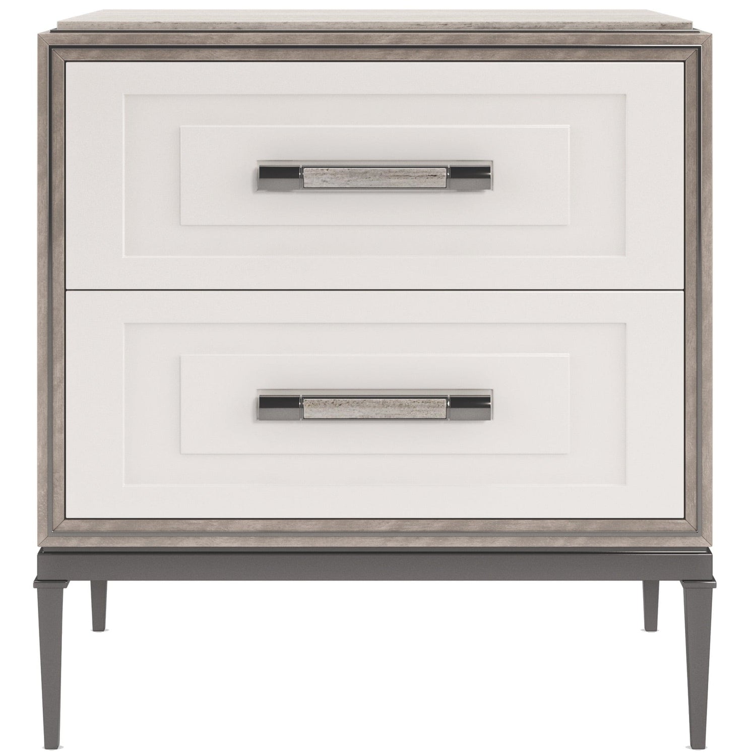 Sophisticated and straightforward, this nightstand artfully mixes organic elements with clean lines and the soft sheen of metal. Custom hardware with a ceramic detail calls attention to the depth and dimension created by stepped drawer fronts in a Pearly White finish. Adding a note of luxe: a Travertine stone top, complemented by the figured wood grain of Silver Curupixa veneers in an earthy Mountain Smoke finish. Designed with two spacious drawers for neatly keeping books and other bedside essentials. Perfectly suited for a casual retreat or stately bedchamber.