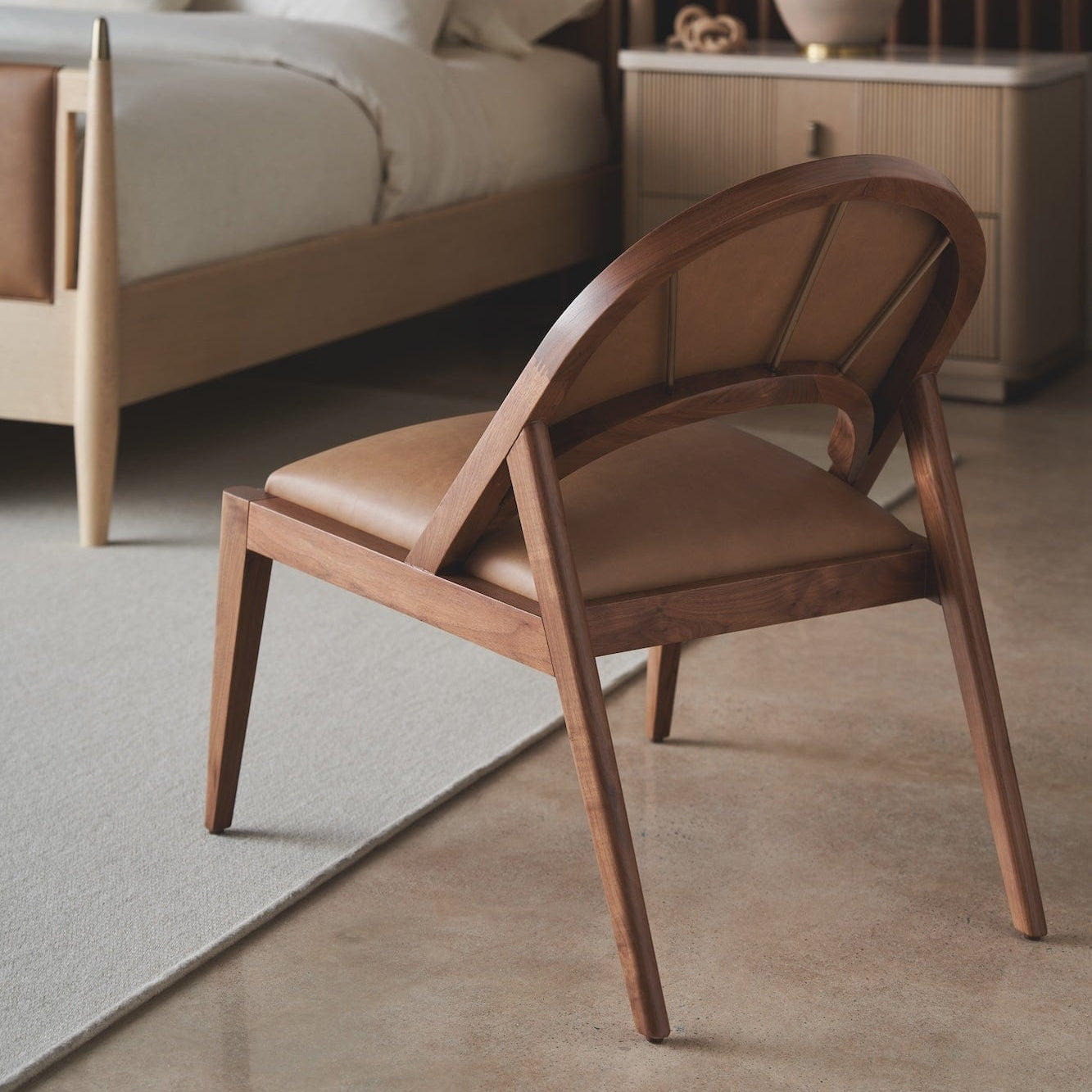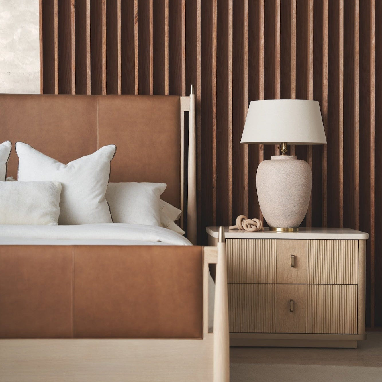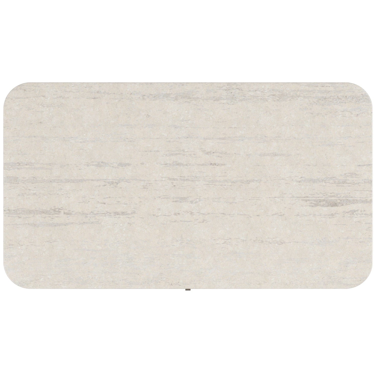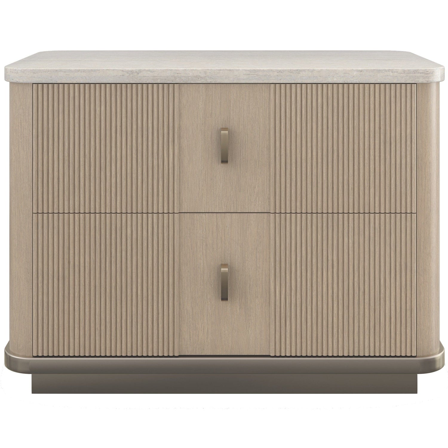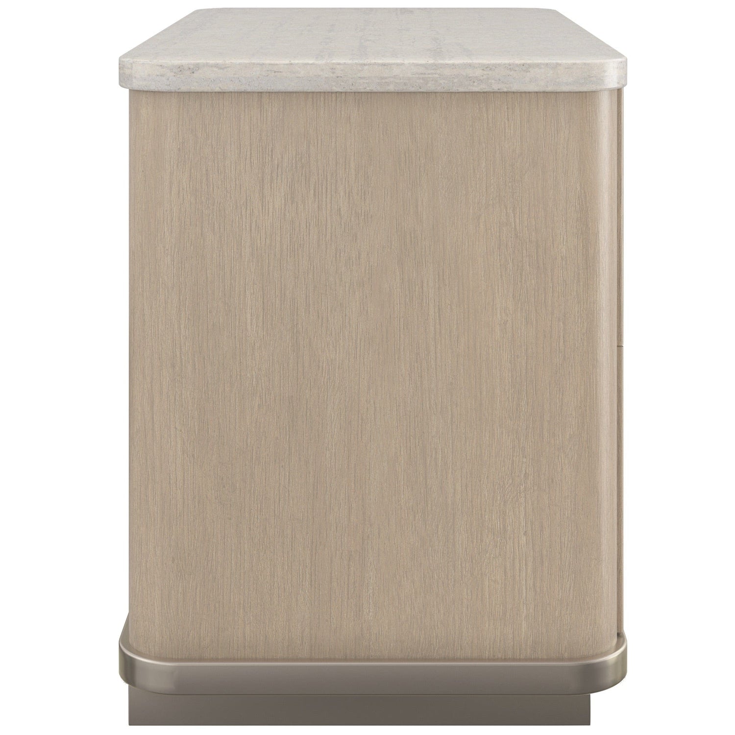 The natural beauty of Sun Drenched oak and a creamy Travertine stone top is punctuated by the visual rhythm created by reeded drawer fronts. Rounded corners and bronze drawer pulls with a subtle contour soften its linear form and add a touch of warmth. Features Linen-painted drawer interiors and access along the back for wire management.