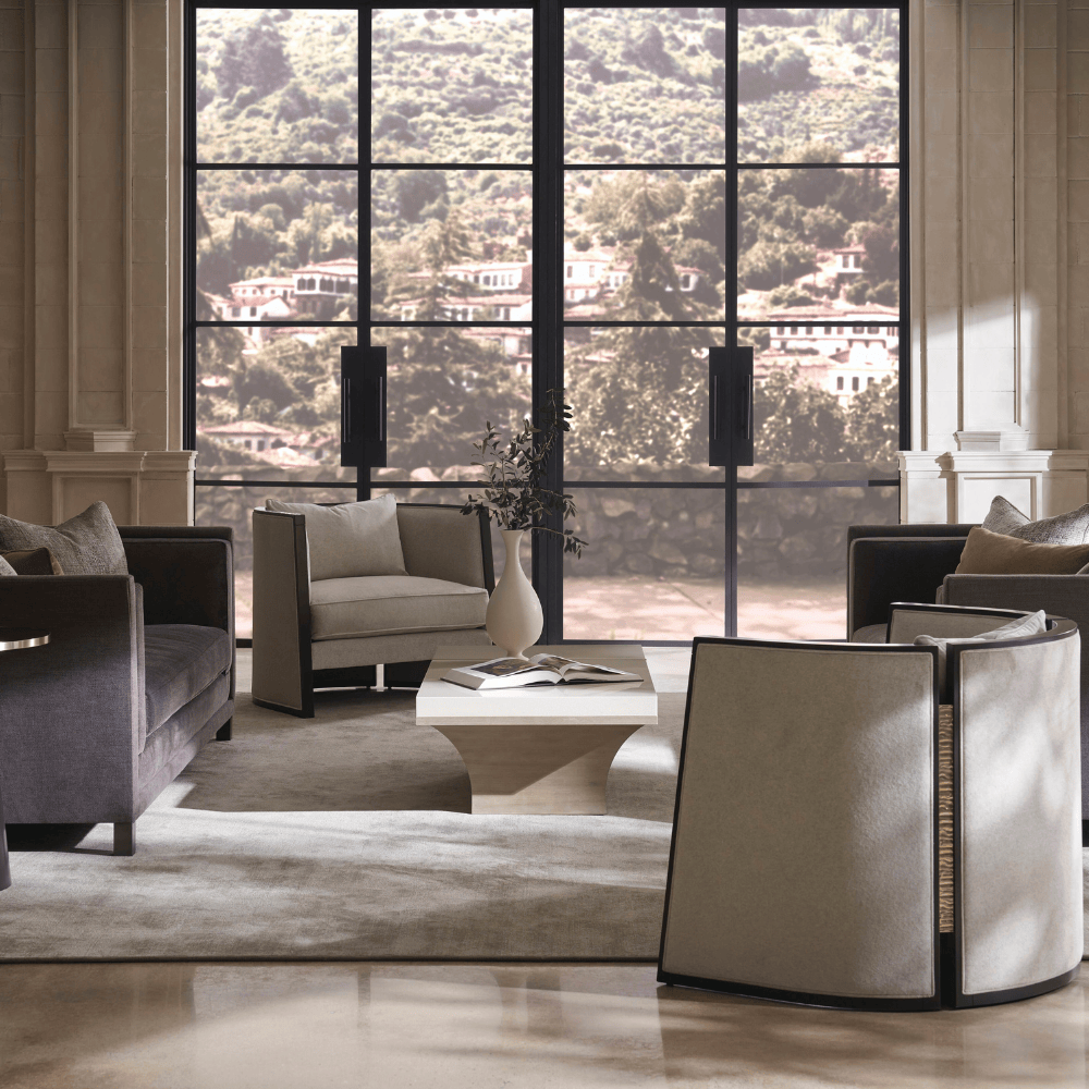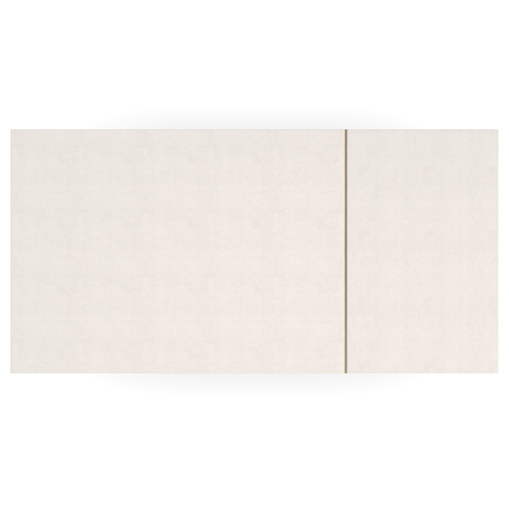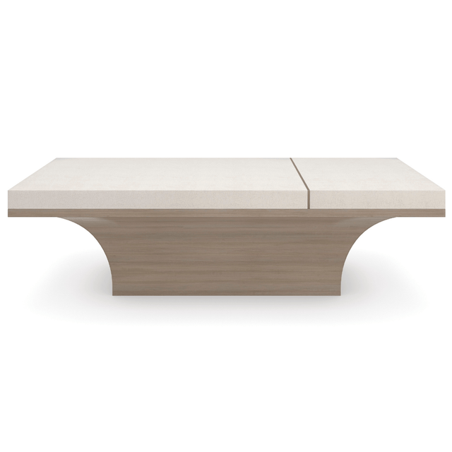 Like a pair of pants precisely tailored to fall just above the shoe, this cocktail table speaks to the delicate tension between texture and material. Features an ample top in a darkly contrasting Forest or Ivory Craze finish, balanced on a swooping Koto wood base that appears to defy gravity. An asymmetrical beaded spline in Brush Gold lends separation and a luxe finishing touch.