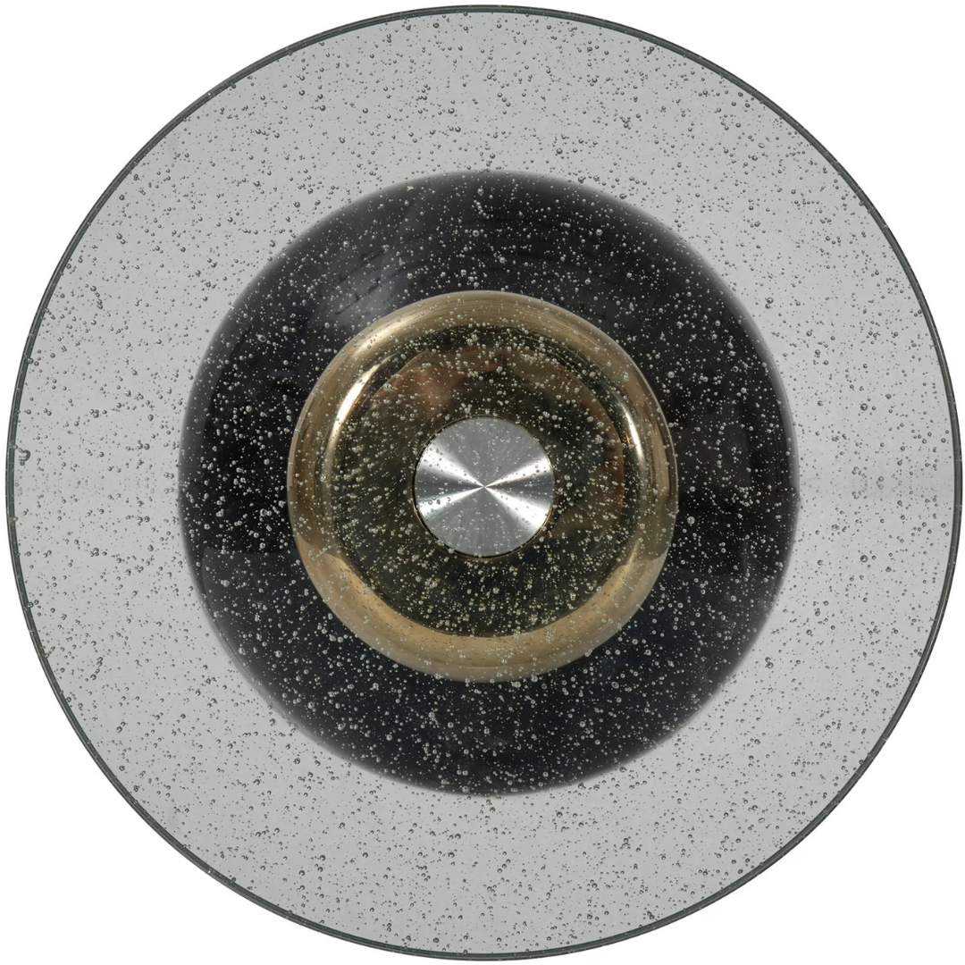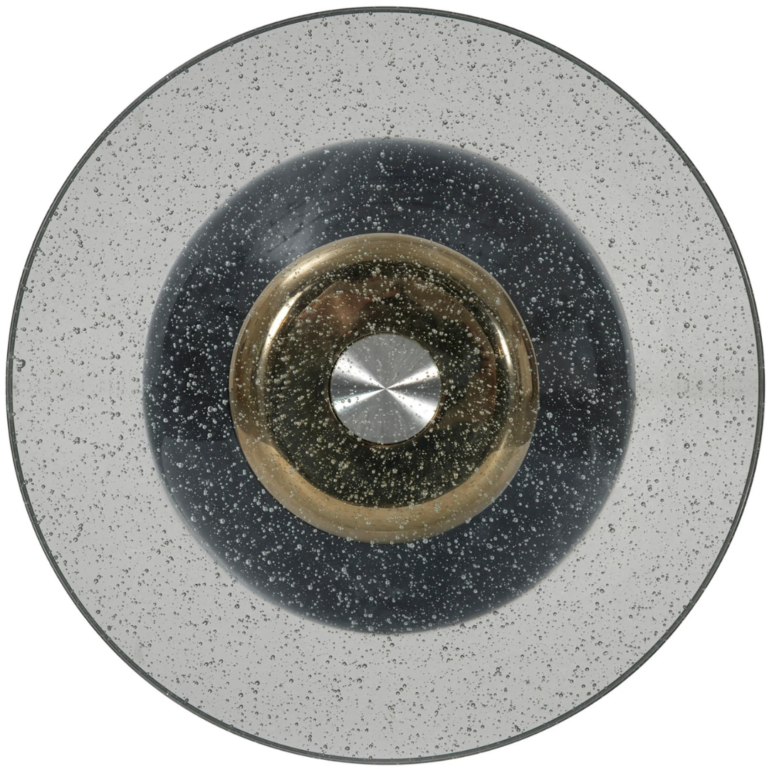 This striking Gelée Accent Table is rich with elegant features. Its top is a substantial piece of clear seeded glass with embedded bubbles that create a wavy, organic pattern. Its contemporized drum-shaped pedestal has been dressed in a high-sheen gloss finish with Whisper of Gold accents and bands. Its base has a padded bottom to prevent the table from sliding.