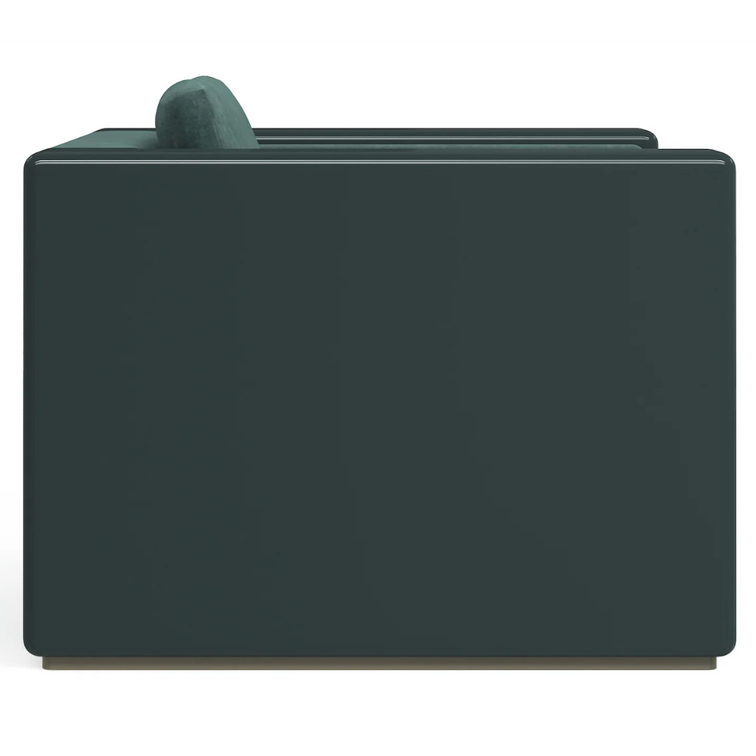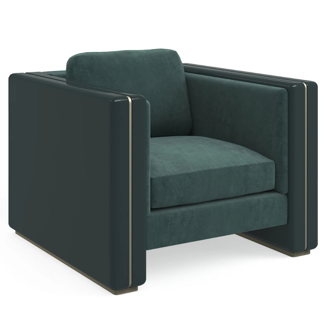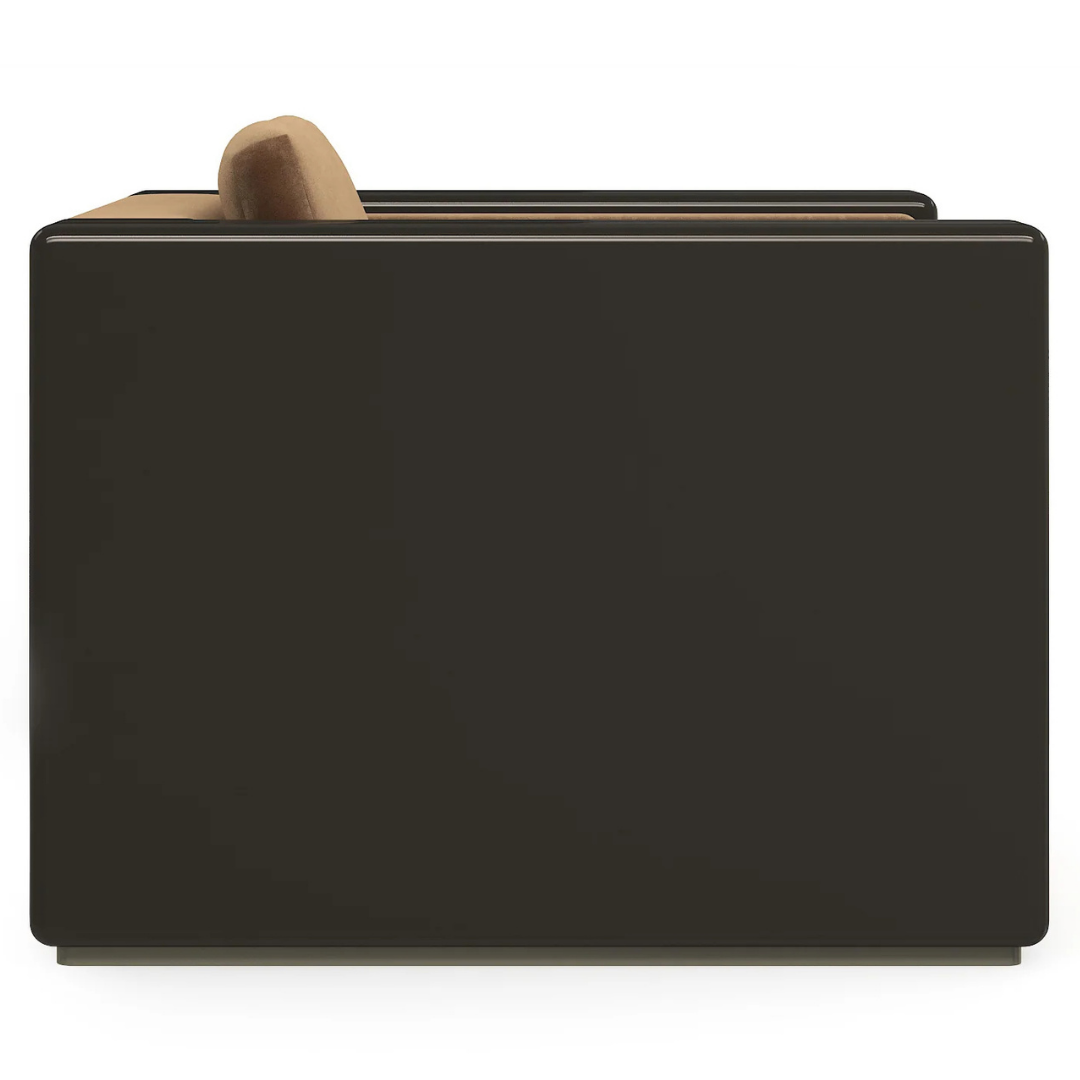 This fully upholstered chair features arms in Apatite Gloss or Chocolate Truffle, accented with decorative metal trim in Whisper of Gold. Designed with a plinth base, the Gelee Chair blends bold finishes with refined detailing for a polished, statement look.