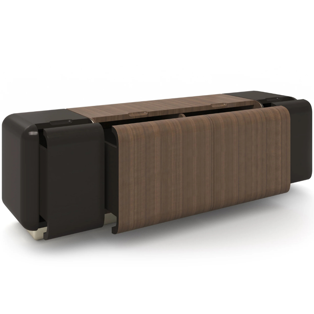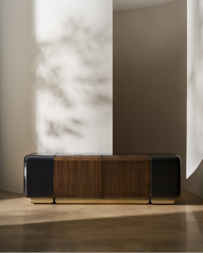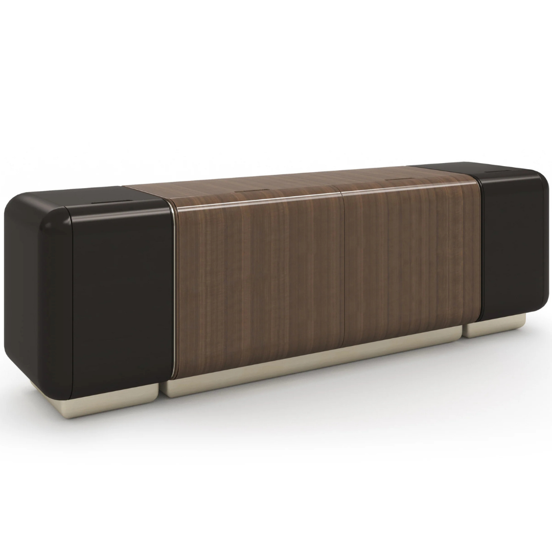 Sleek, glossy, and streamlined, this impressive piece mixes patterns and textures for a distinctive, timeless effect and adds a punch of rich color to any family room. The console features generously rounded edges and compound curves that create a dramatic waterfall effect, with a high-gloss finish over hand-pieced Tupelo wood and delicate Whisper of Gold splines. This two-toned piece sits on a concave-sculpted three-part base that shimmers in Oracle leaf. It has four drawers with hand-pulls on top and soft-close under-mount guides, and the interior is painted to match.