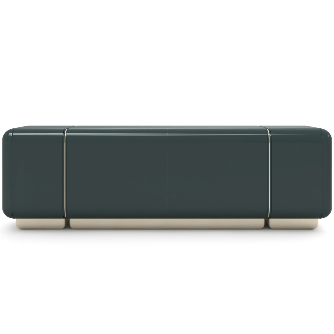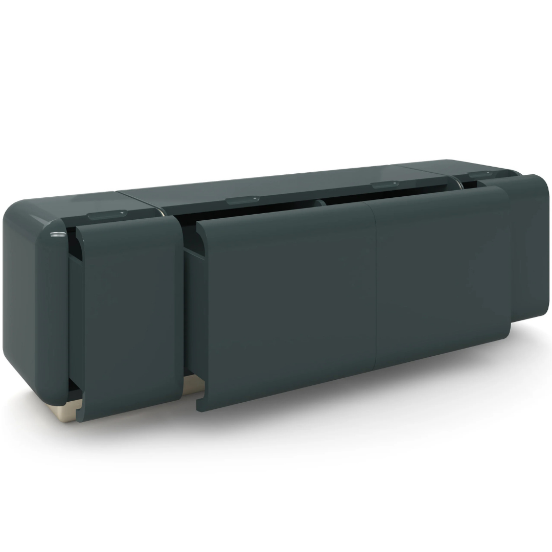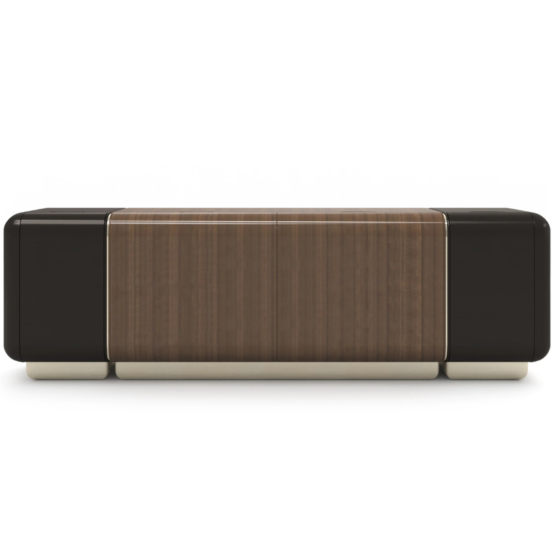 Sleek, glossy, and streamlined, this impressive piece mixes patterns and textures for a distinctive, timeless effect and adds a punch of rich color to any family room. The console features generously rounded edges and compound curves that create a dramatic waterfall effect, with a high-gloss finish over hand-pieced Tupelo wood and delicate Whisper of Gold splines. This two-toned piece sits on a concave-sculpted three-part base that shimmers in Oracle leaf. It has four drawers with hand-pulls on top and soft-close under-mount guides, and the interior is painted to match.