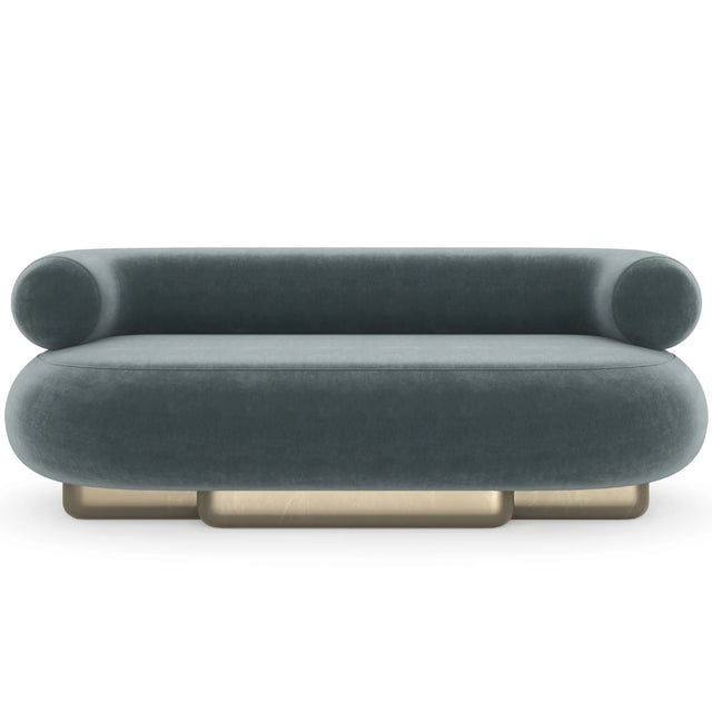 Float this iconic sofa in the center of a room and rejoice in its graceful postmodern beauty. Bathed in vintage Peacock velvet the substantial curved bolster back rests atop a deep bean-shaped seat. The base showcases the movement of waves in hand-applied Oracle leaf.