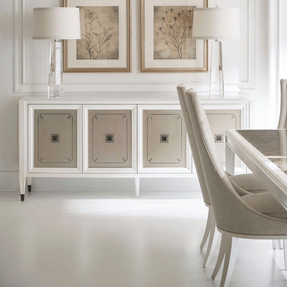 Elevate any occasion with this exquisite glass top dining table, featuring mirrored panels embellished in Soft Silver paint to create a Moroccan-tiled, geometric pattern. A shimmering Stardust finish dramatically defines its solid wood frame with tall, tapered legs capped in Deep Bronze metal ferrules. Accommodates up to 14 guests when fully extended.