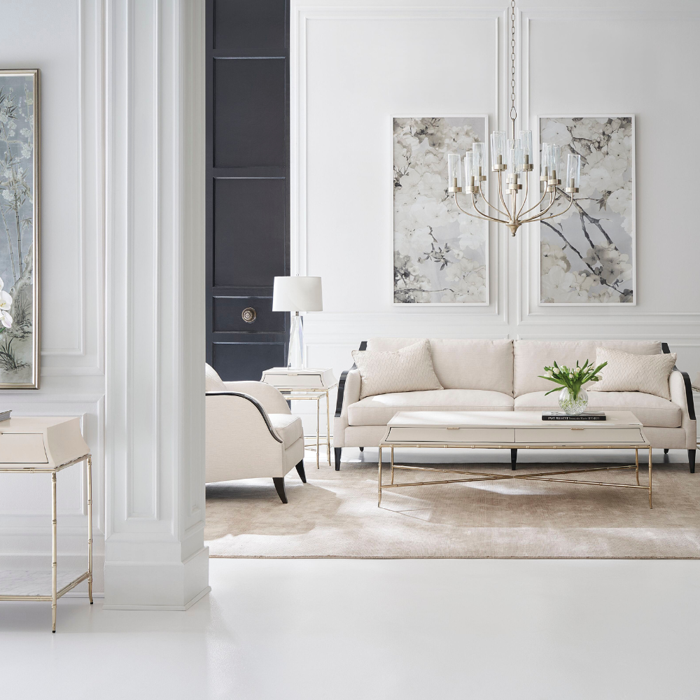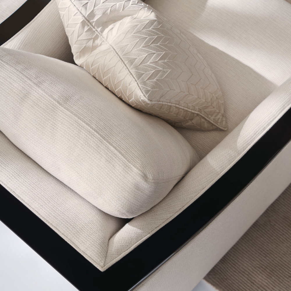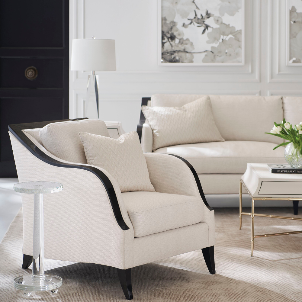 Like our Pitch Perfect sofa, this sleek track arm style is elegantly defined by an exposed wood frame in a richly contrasting, Chocolate Truffle finish. Introduces a classic silhouette, finely tailored in a cream basketweave and accented with a kidney back pillow for added comfort.