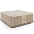 The Rhythm Cocktail Table showcases a luxurious Travertine stone top, complemented by a Sun Drenched Oak case with reeded doors. Supported by a refined Neutral Metallic frame and base, this table beautifully blends natural elegance with contemporary sophistication.