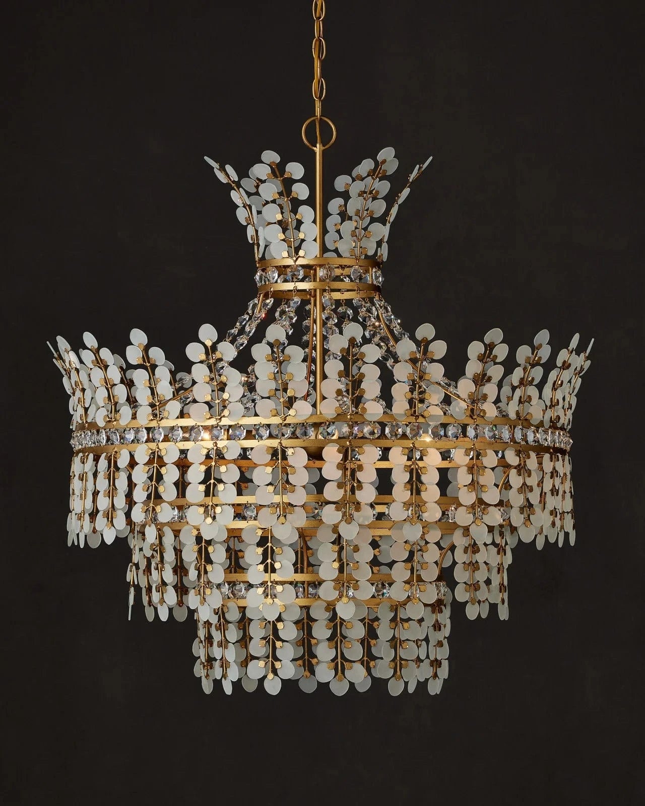 The Bradshaw Chandelier has an elegant classical profile for which its designer, Bunny Williams, is renowned. Made of wrought iron in a warm brass finish, the layered shape has sparkling crystal baguettes in each of the rings and frosted glass discs that flutter up and extend down to create flourishes on the top and bottom, the uppermost curved like coronets. The milky glass pieces, which are made specifically for this fixture individually, have edges that are polished for a sophisticated feel. Each one and each of the crystals are attached by hand. Williams was inspired by an antique with an Art Deco feel when she envisioned this luminous four-light fixture.