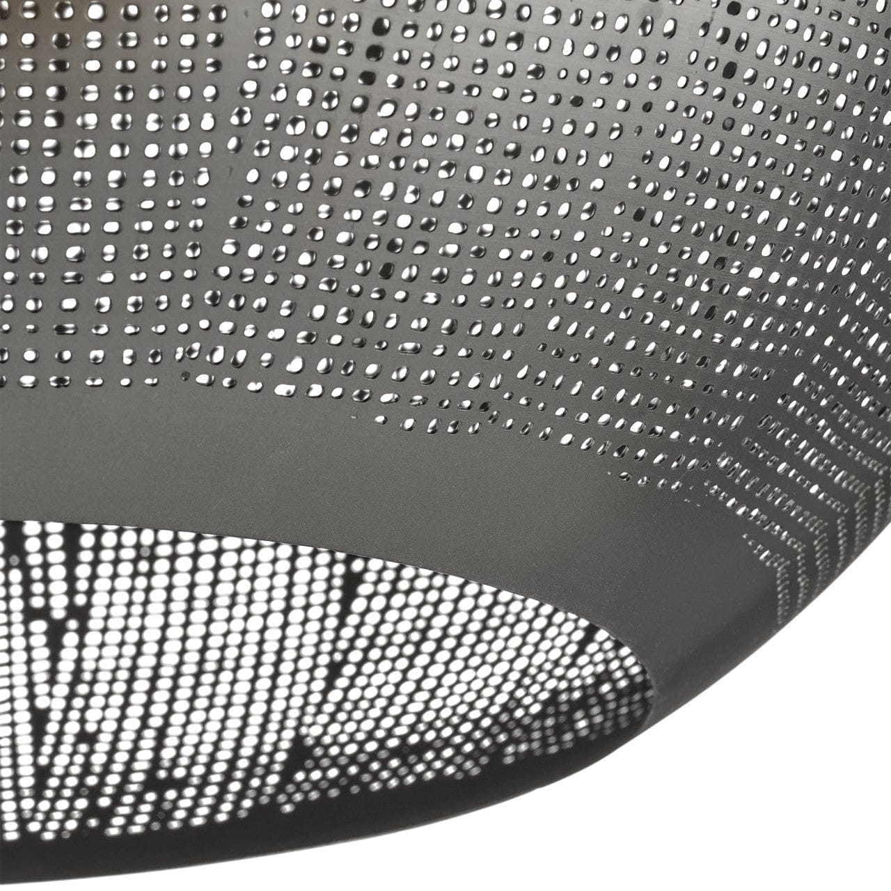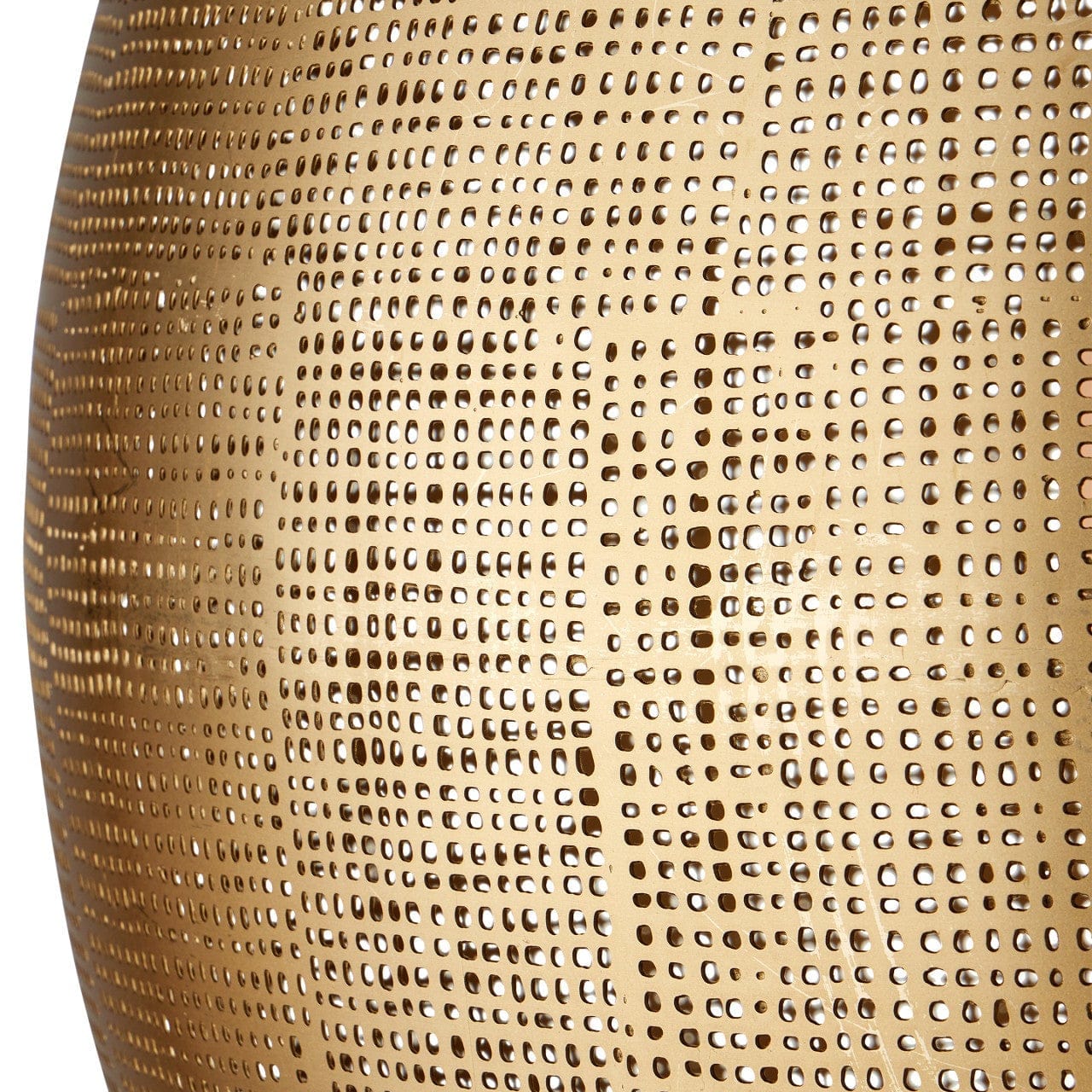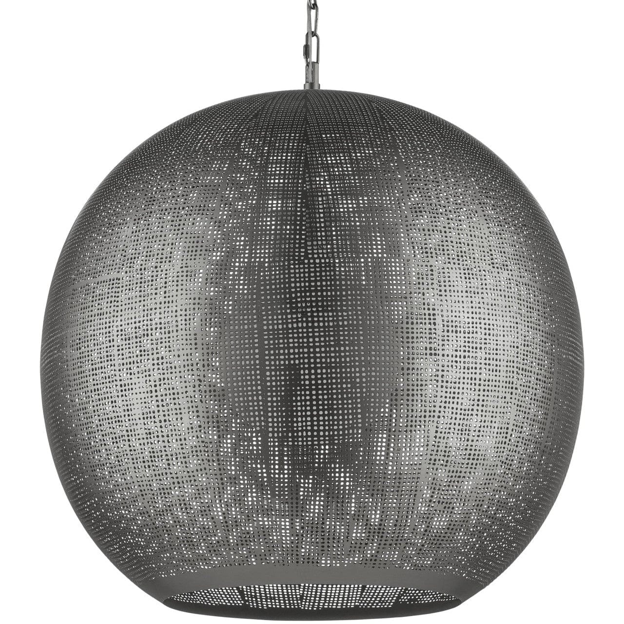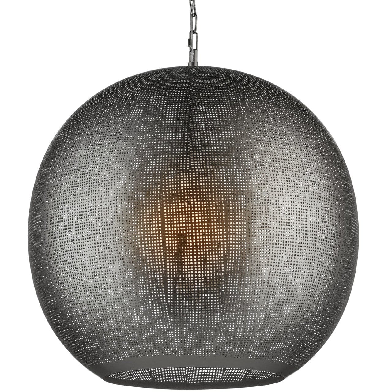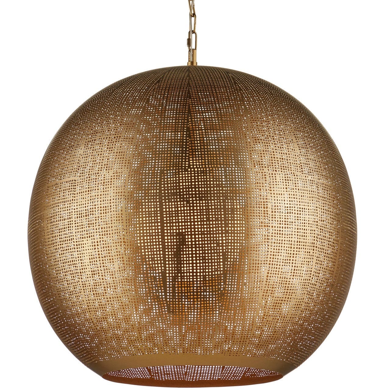 The Buckram Orb Pendant is crafted from curved panels of iron in an antique brass and black nickel finish that are joined together to create its shape. The pierced metal shade has an acid-etched surface with areas of heavier texture that highlight its handmade character. Inside, an oversized frosted LED bulb glows through the openings, adding both light and dimension. The result is a pendant with rich texture and a distinctive artisanal feel. The fixture has one light and is dimmable.